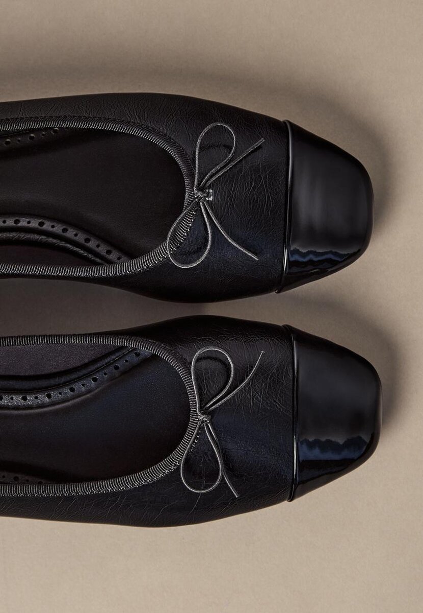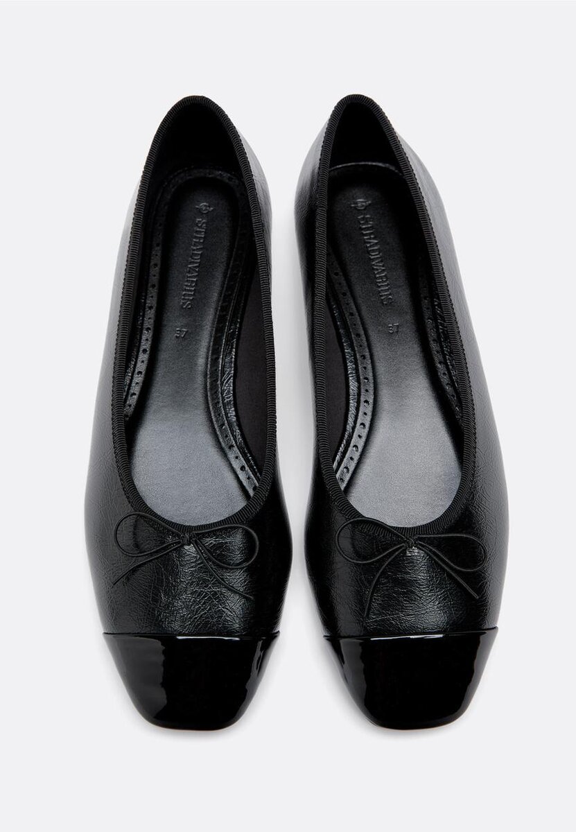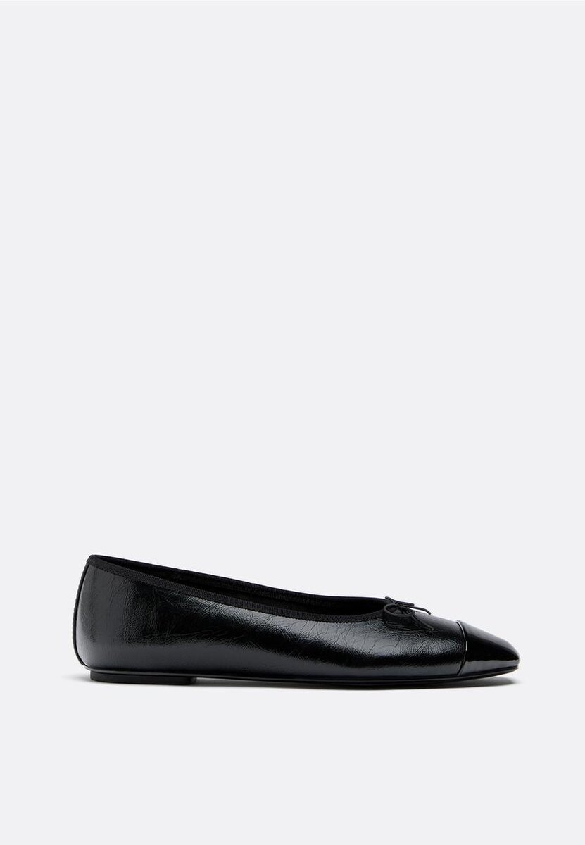 Balletky v koženém vzhledu s lakovanou špičkou. Mašlička na špičce.