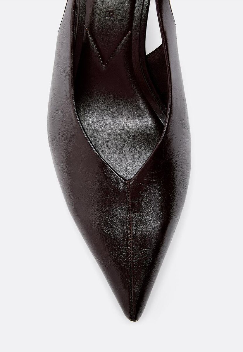 Boty na podpatku v koženém vzhledu. Špičatá špička. Výstřih do V. K dispozici v černé, hnědé a ecru barvě. Výška podpatku: 5 cm
