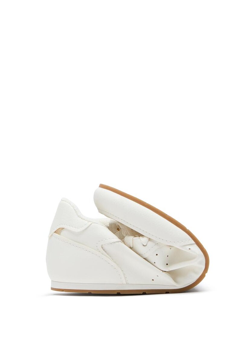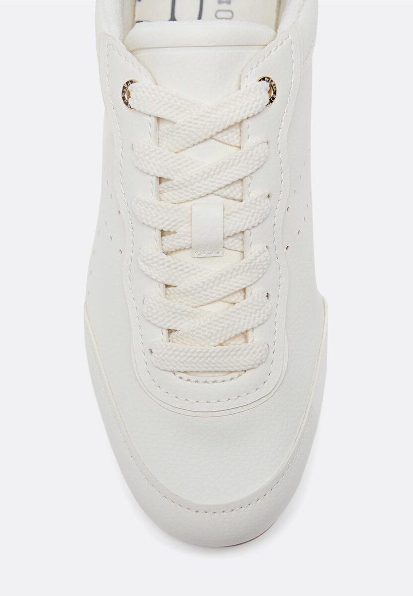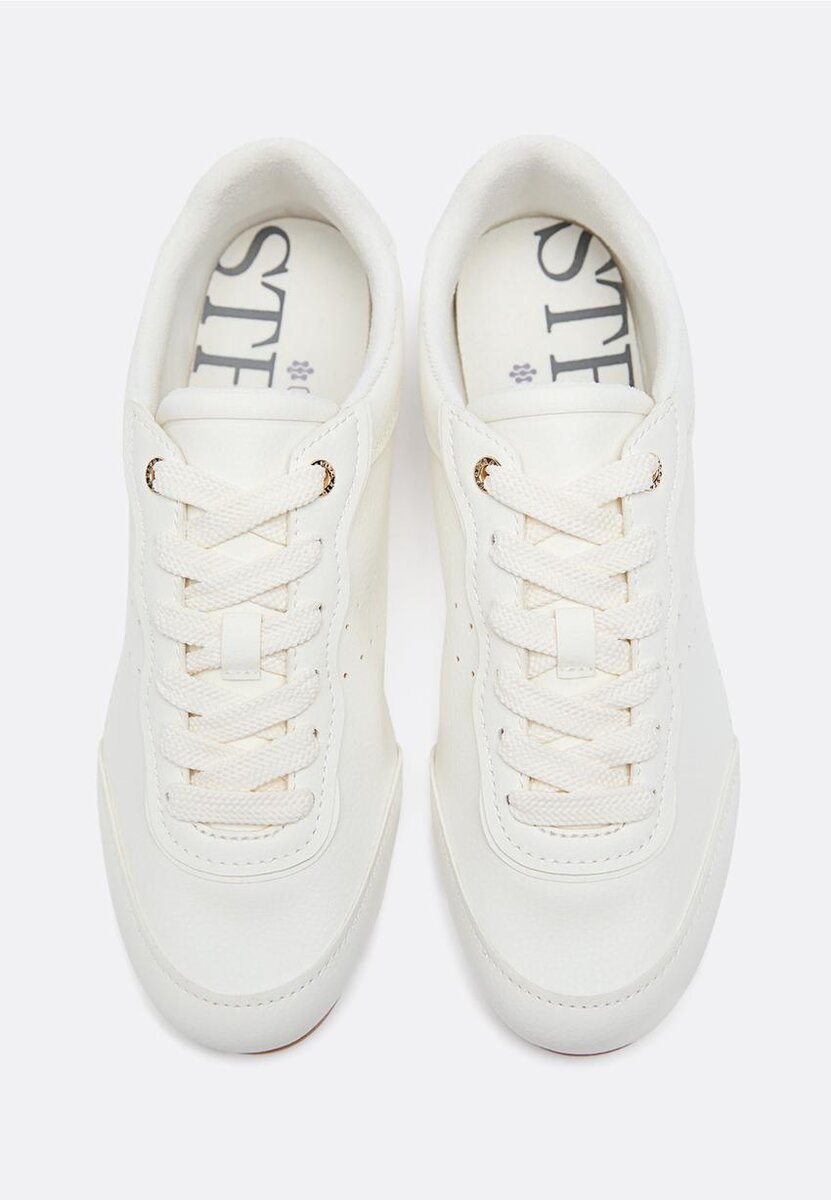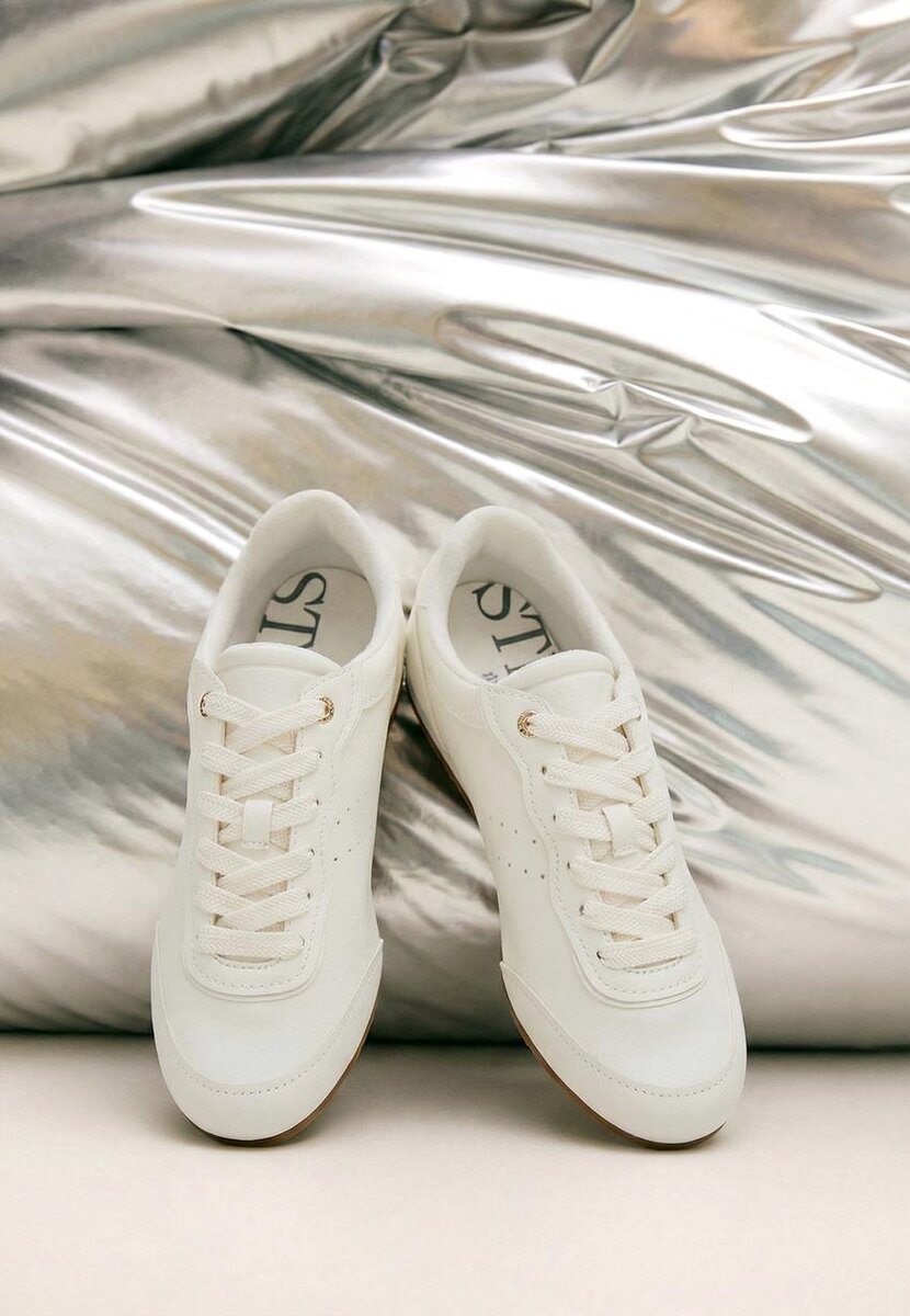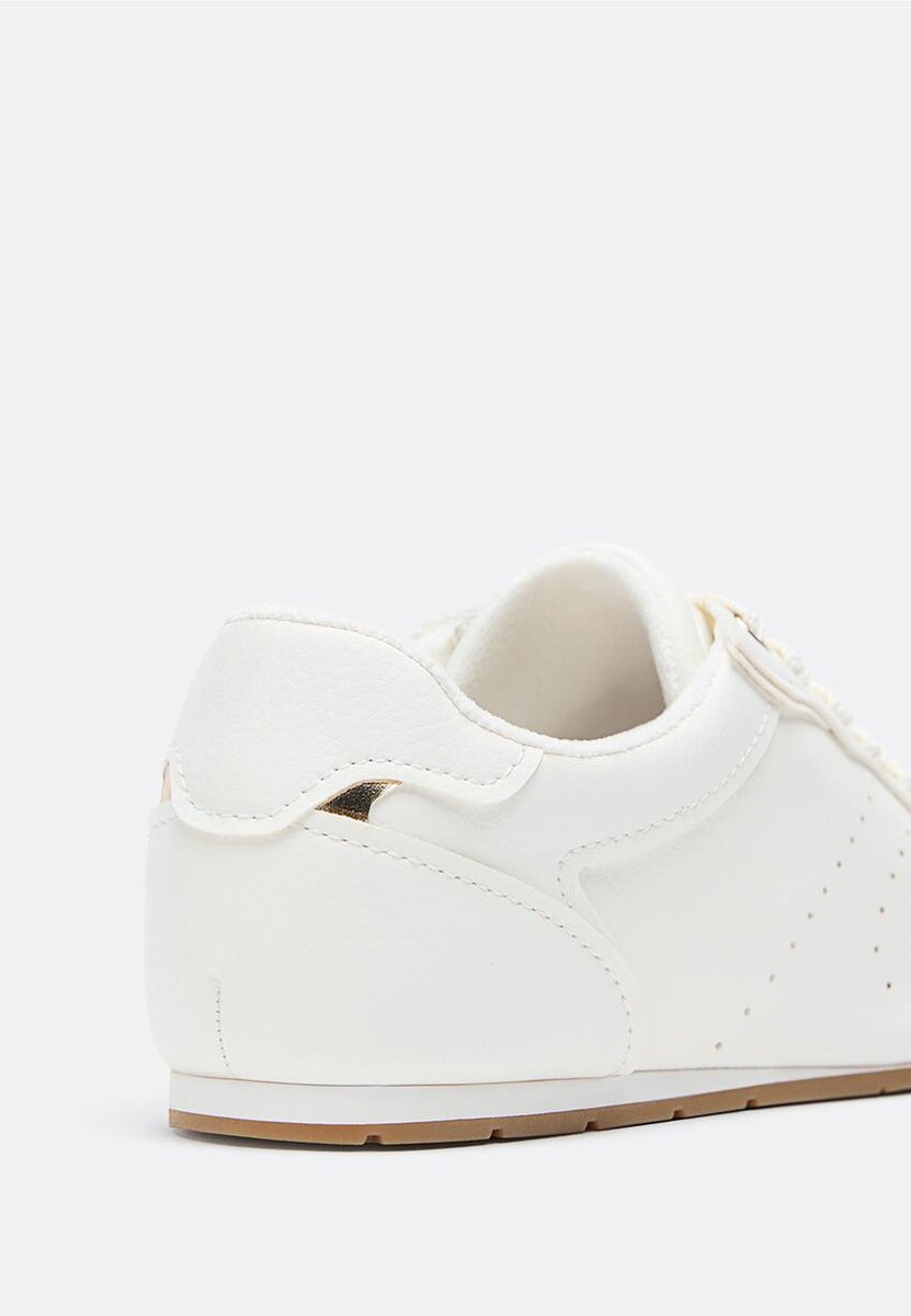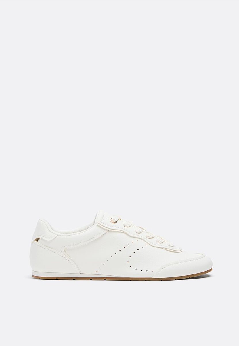 Měkké tenisky s plochou podrážkou. Prolamované detaily na bocích. Šněrovací zapínání. Zlatý detail na patě. K dispozici v bílé barvě.