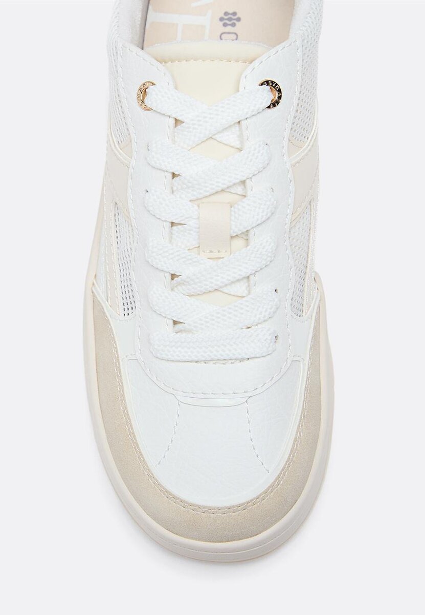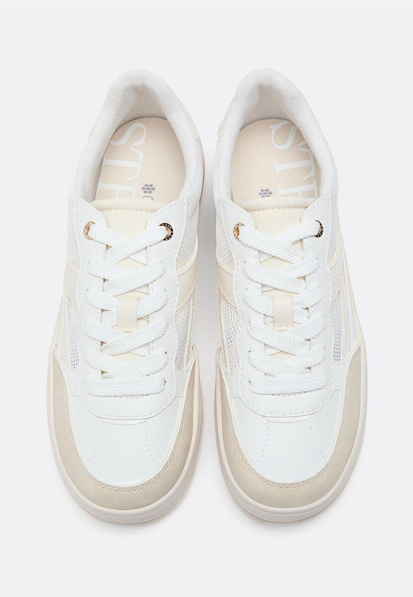 Tenisky na platformě s kombinací prolamovaných a hladkých materiálů. Šněrovací zapínání. K dispozici v béžové barvě. Výška podrážky: 5 cm.