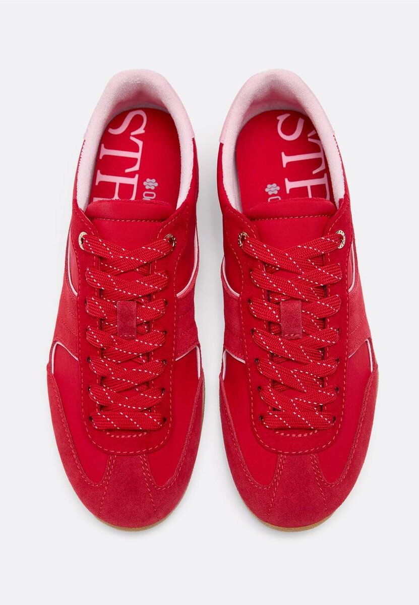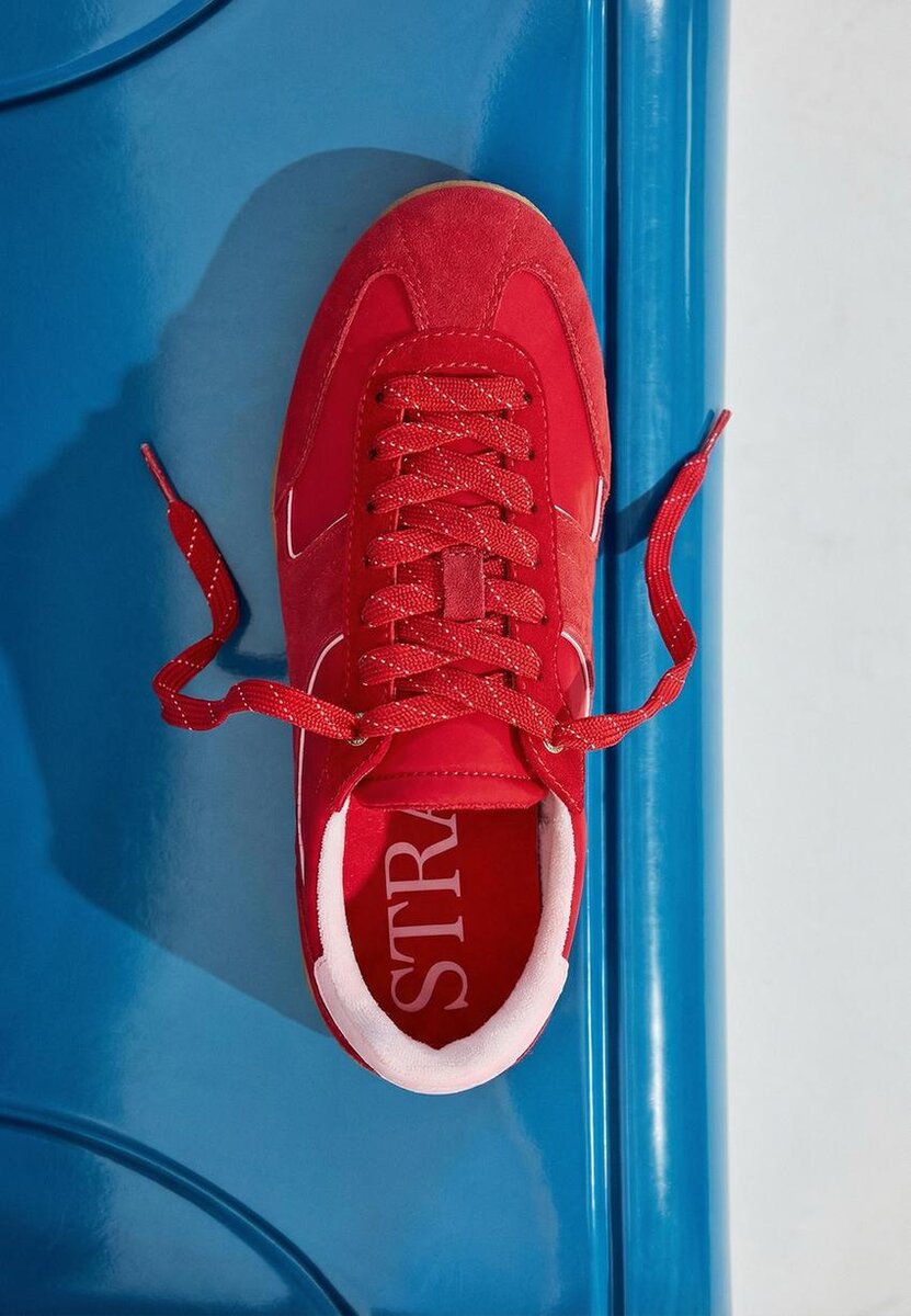 Tenisky s plochou podrážkou a detaily z kůže na bocích, špičce a patě. Šněrování. K dispozici v červené barvě. Výška podrážky: 2,5 cm.