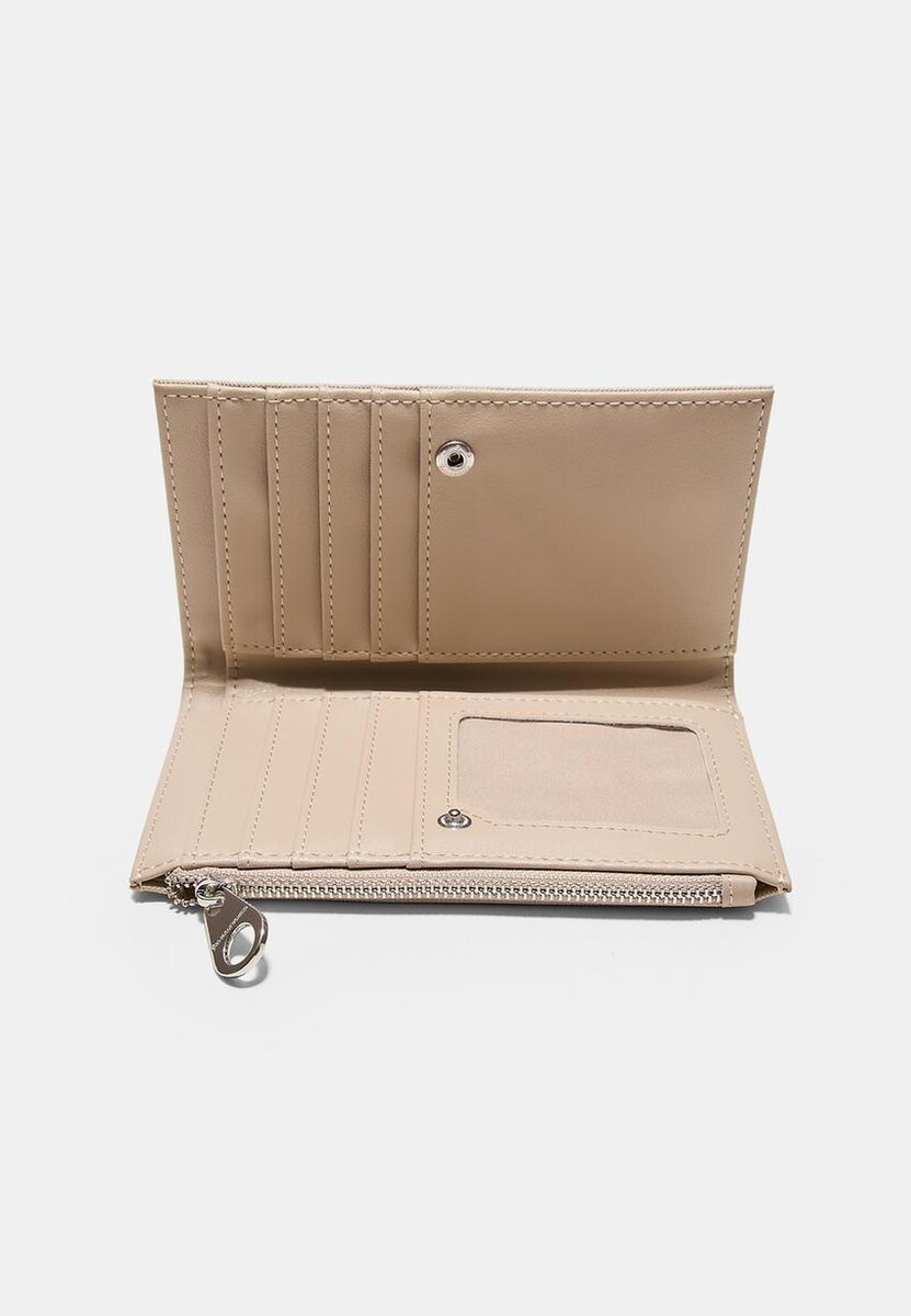 Plochá, obdélníková peněženka s horním zapínáním na zip. Na přední straně má kovový detail s logem.