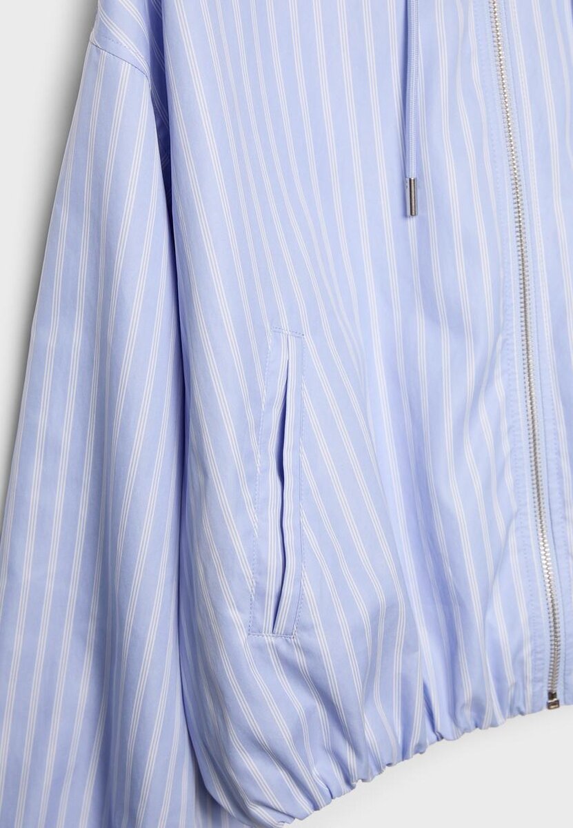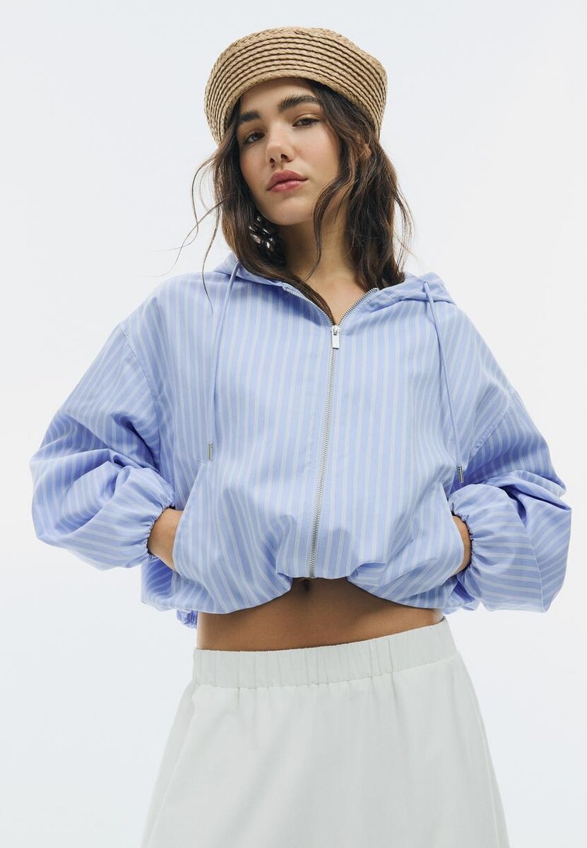 Basic bunda s nastavitelnou kapucí na stahovací šňůrku. Vlastnosti: dlouhé rukávy s elastickými manžetami, přední kapsy, zapínání na zip vpředu a elastický spodní lem.