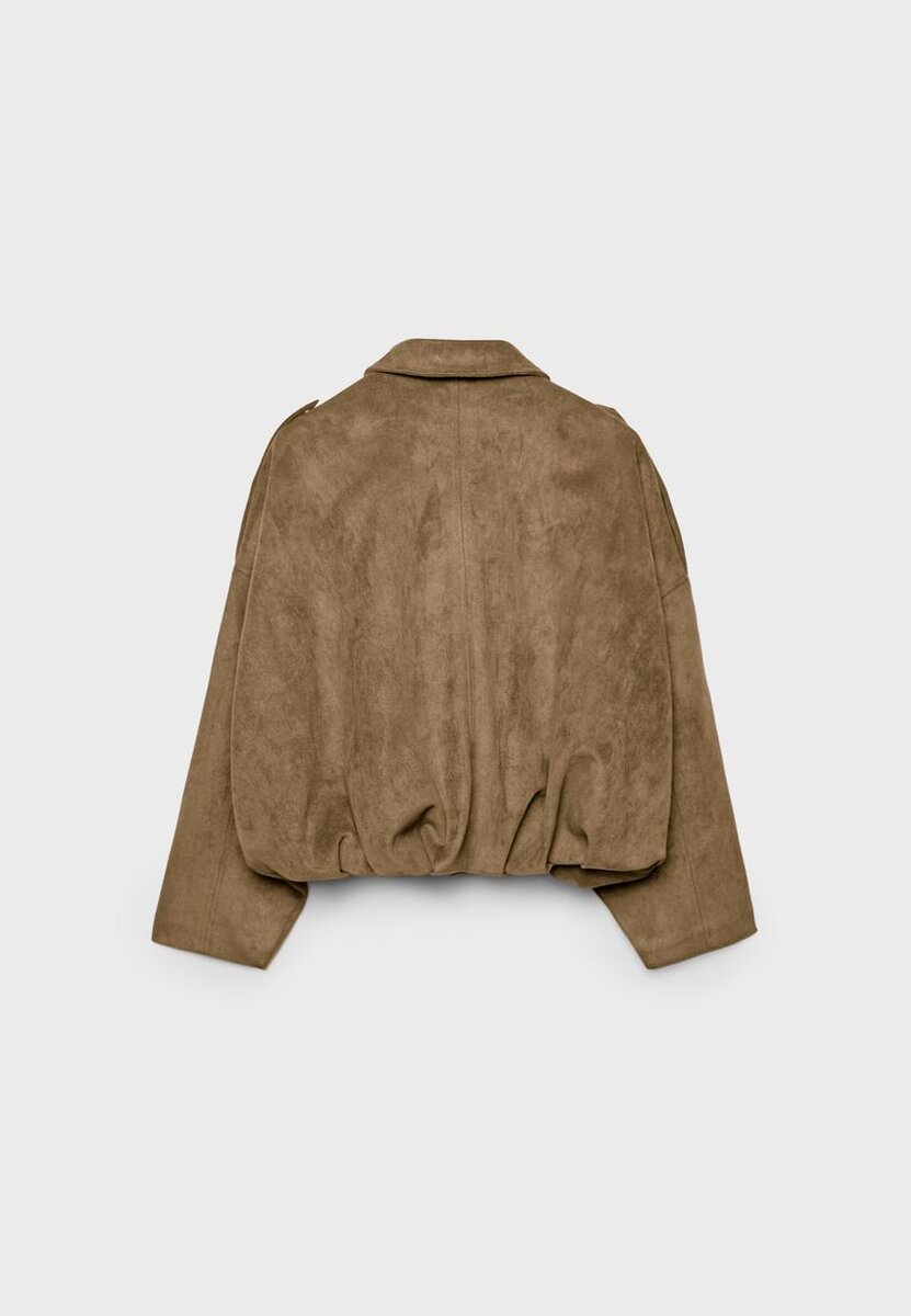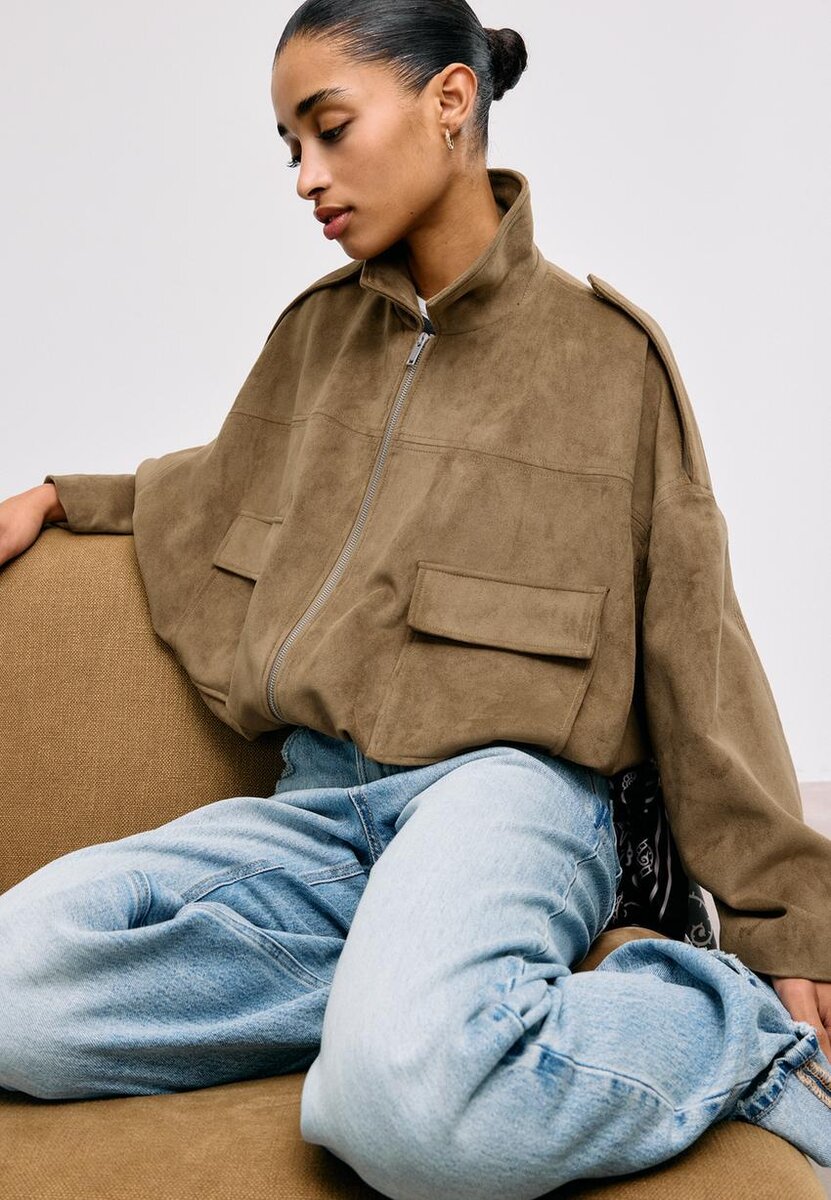 Bunda z umělé semišové látky. Bomberový střih s klopovým límcem. Dlouhé rukávy a elastický spodní lem. Náprsní kapsy. Zapínání na zip vpředu. Detaily na ramenních páscích. K dispozici v různých barvách.