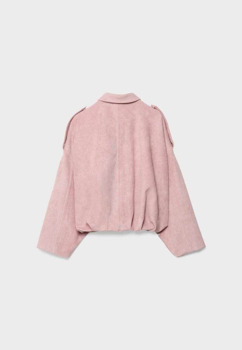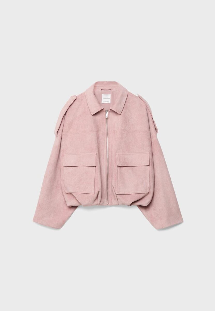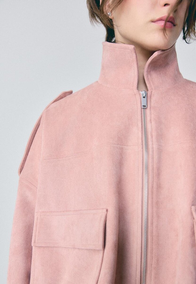 Bunda vyrobená z umělé semišové tkaniny. Bomberový styl s klopovým límcem. Dlouhé rukávy a elastický spodní lem. Náprsní kapsy. Zapínání na zip vpředu. Detaily na ramenních páscích. K dispozici v různých barvách.