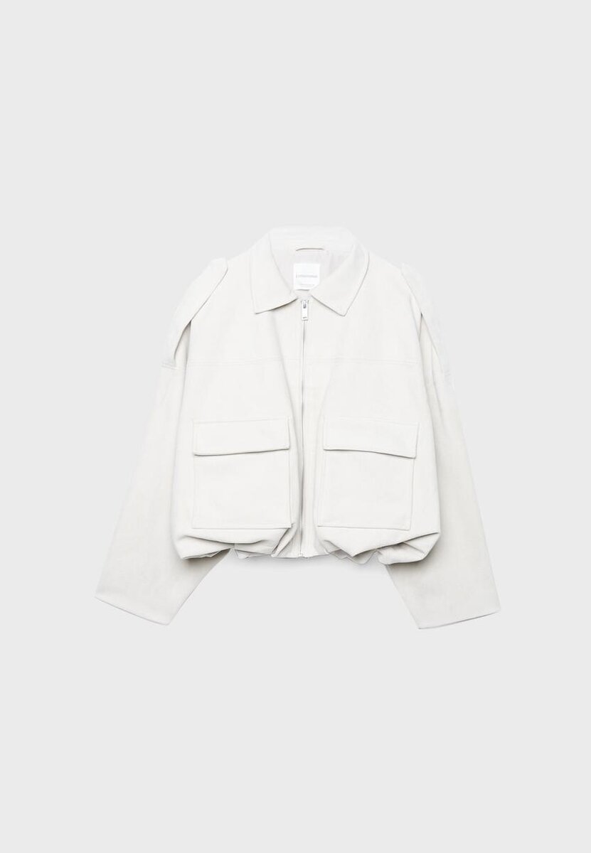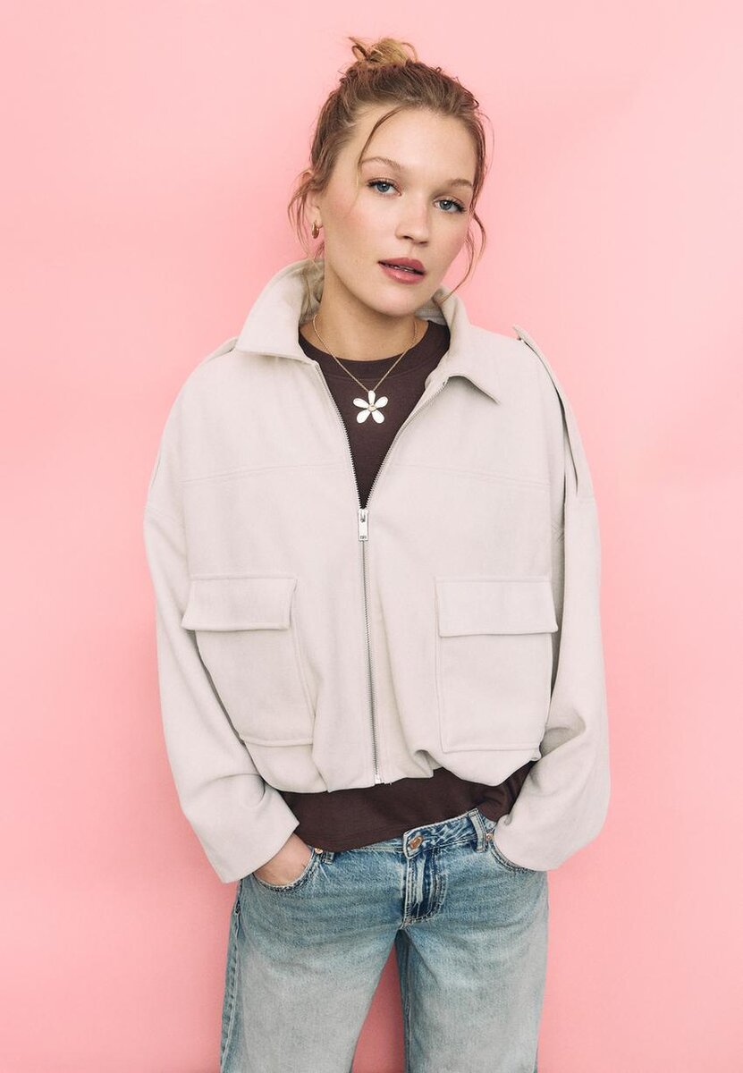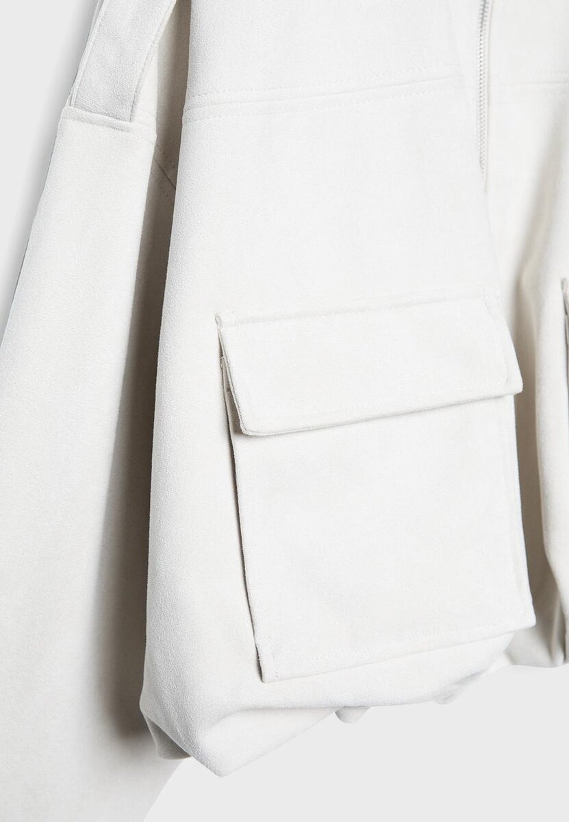Bunda z umělé semišové látky. Střih bomber s klopovým límcem. Dlouhé rukávy a elastický spodní lem. Náprsní kapsy. Zapínání na zip vpředu. Detaily na ramenních nášivkách. K dispozici v různých barvách.