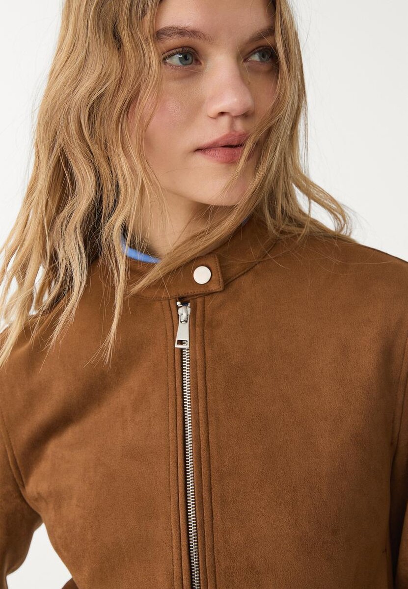 Přiléhavá bunda z umělé semiše. Má stojatý límec s drukem a dlouhé rukávy. Zapínání vpředu na kovový zip. K dispozici v různých barvách.
