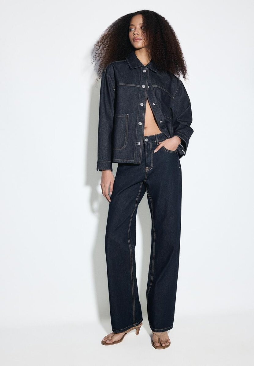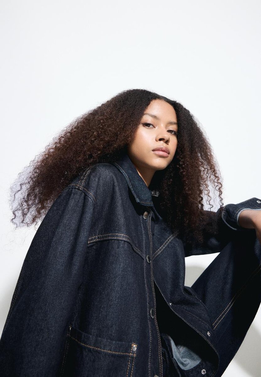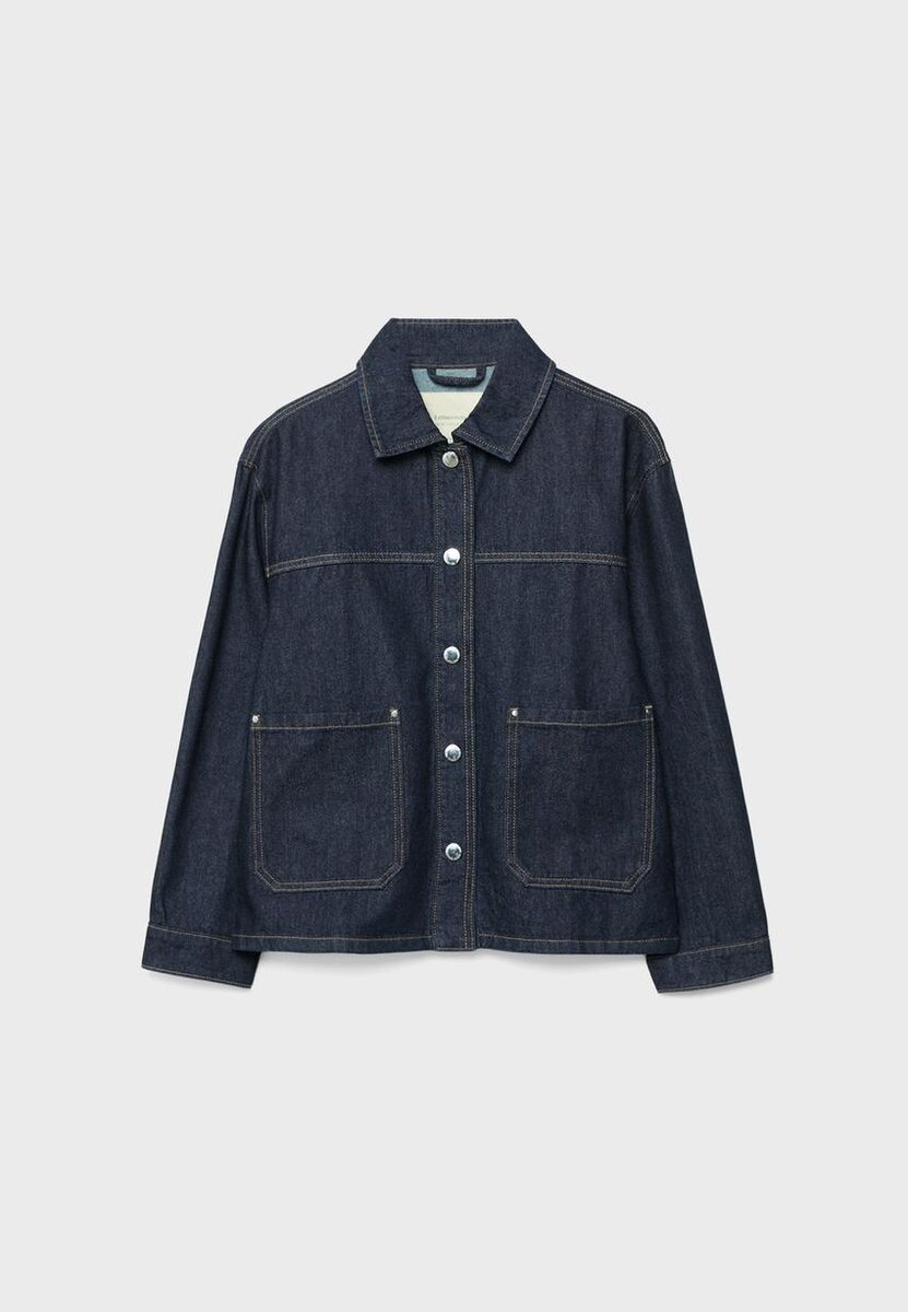Džínová bunda s límečkem, dlouhými rukávy a manžetami na knoflíky. Náprsní našité kapsy. Zapínání na kovové druky vpředu.