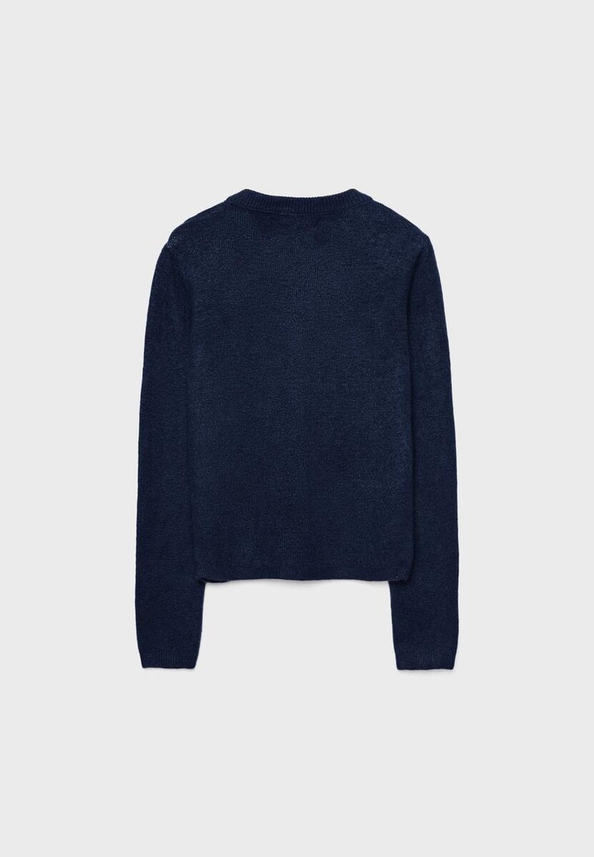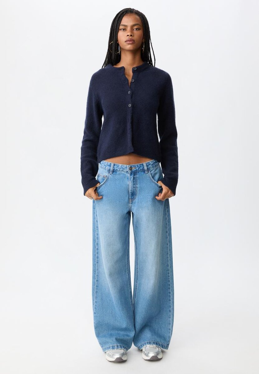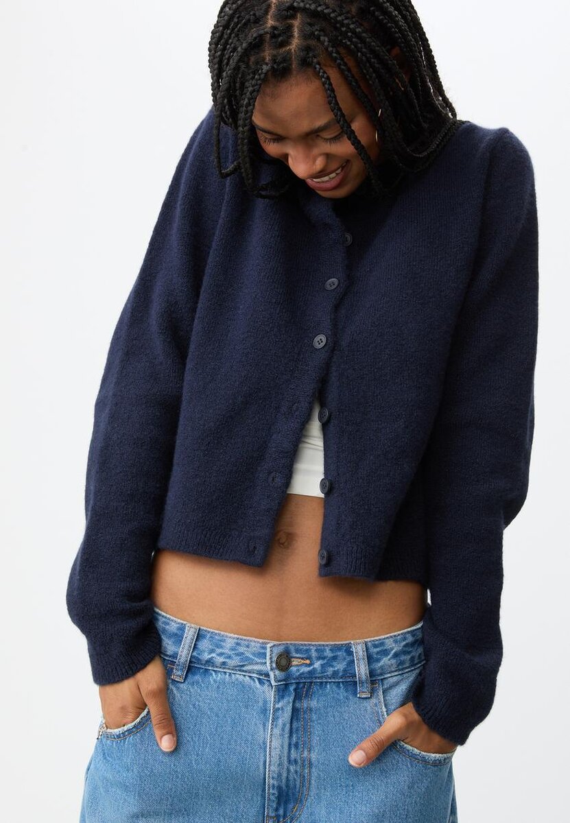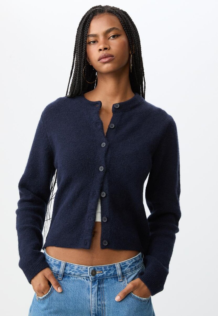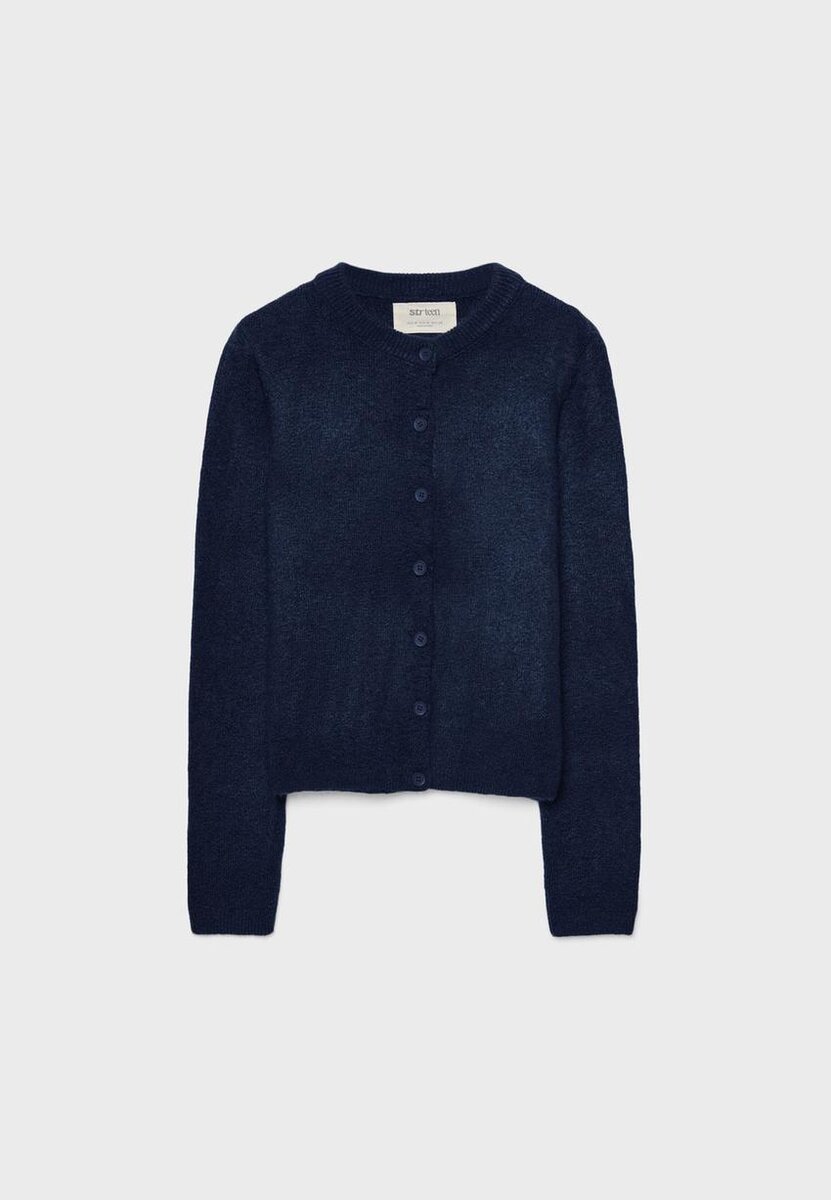 Pletená bunda s kulatým výstřihem a dlouhými rukávy. Zapínání na knoflíky vpředu. K dispozici v různých barvách.