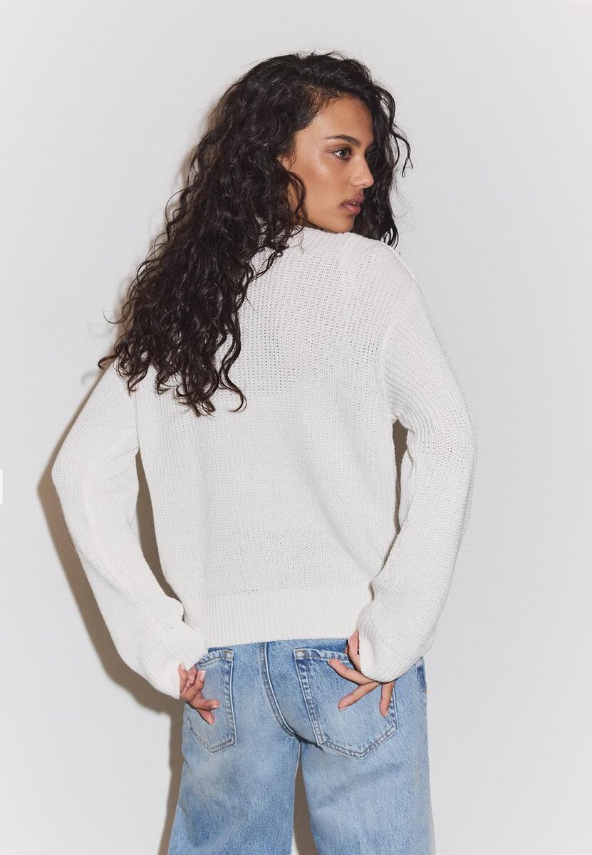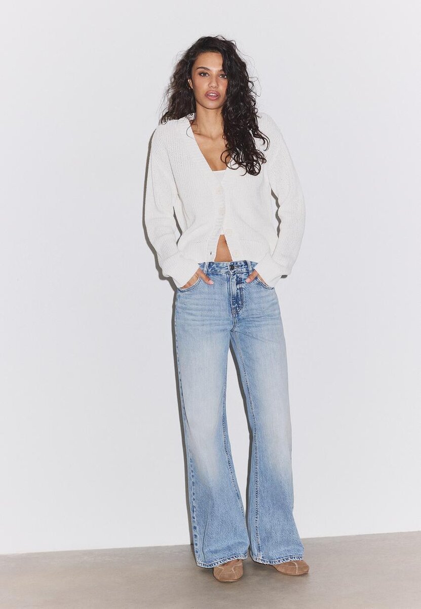 Pletený kardigan s výstřihem do V, dlouhými rukávy, žebrovanými lemy a zapínáním na knoflíky vpředu. K dispozici v několika barvách.