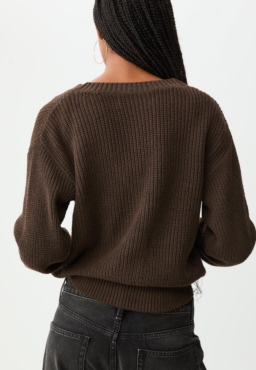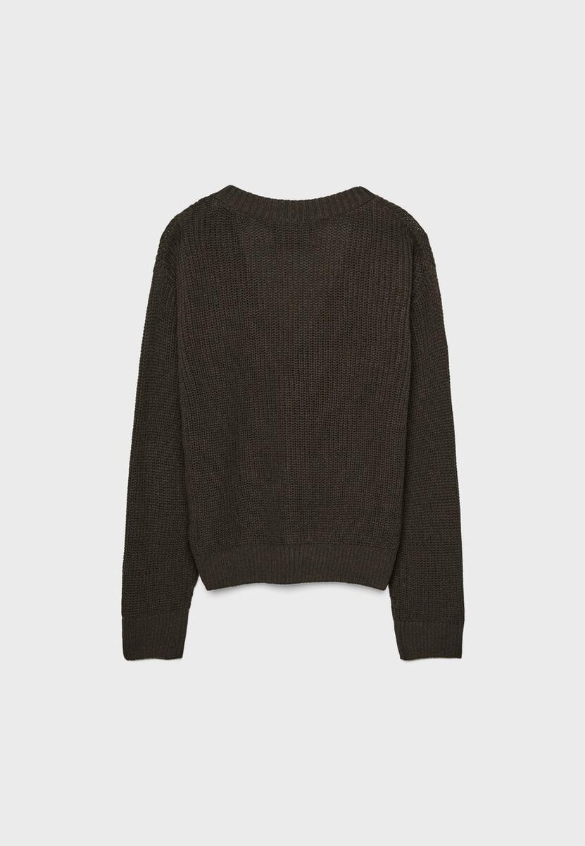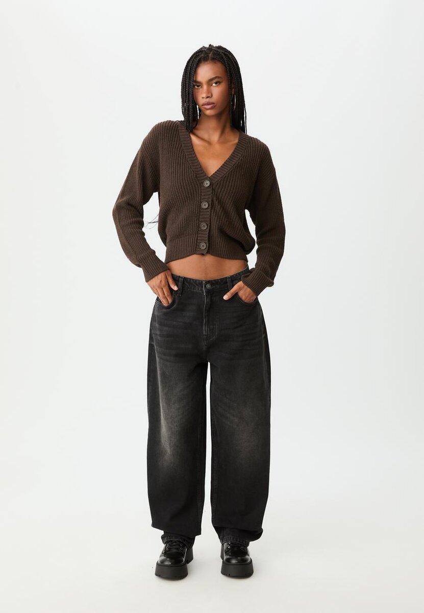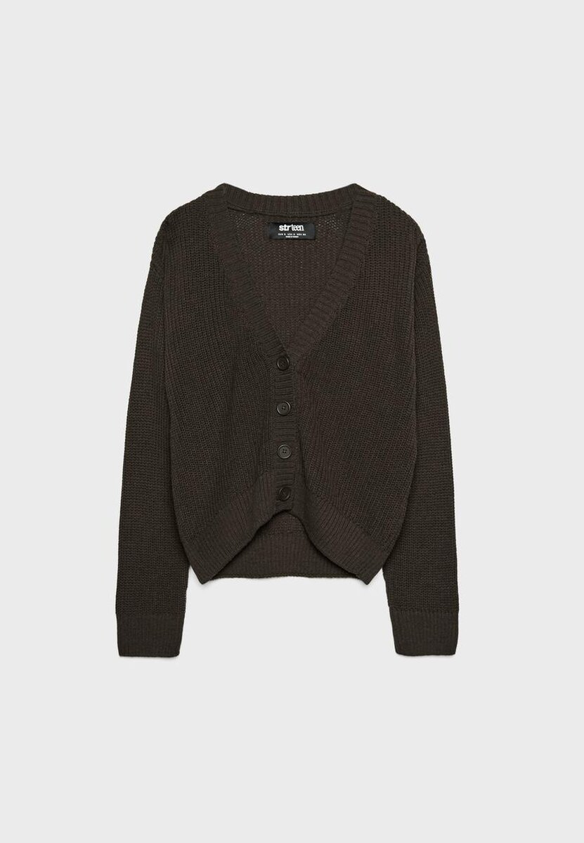 Pletený kardigan s výstřihem do V, dlouhými rukávy, žebrovanými lemy a zapínáním na knoflíky vpředu. K dispozici v několika barvách.