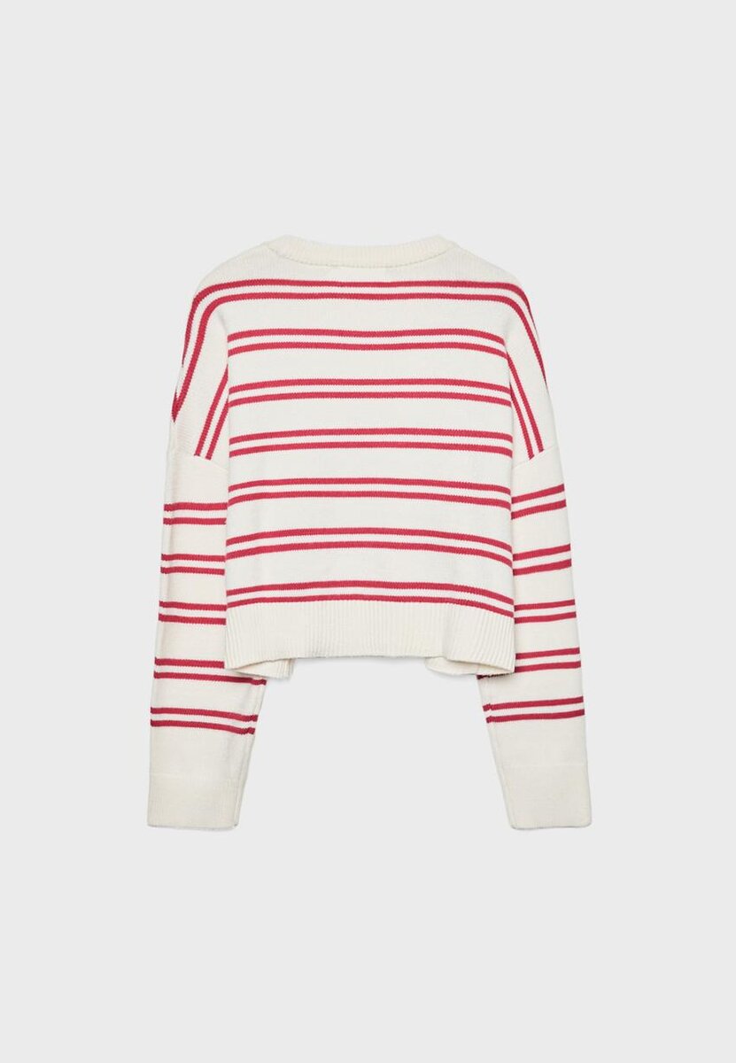 Pruhovaný zkrácený pletený svetr. Kulatý výstřih a dlouhé rukávy. Žebrované lemy. K dispozici v několika barvách.