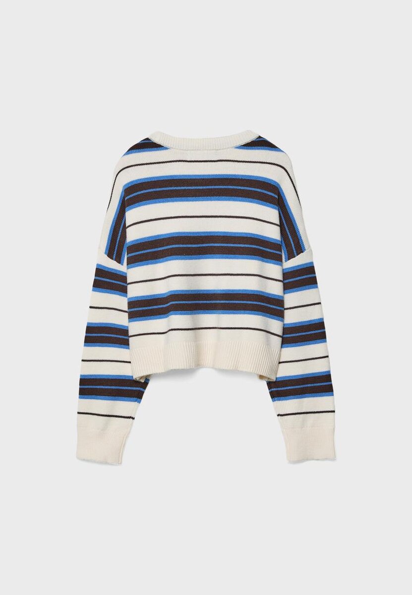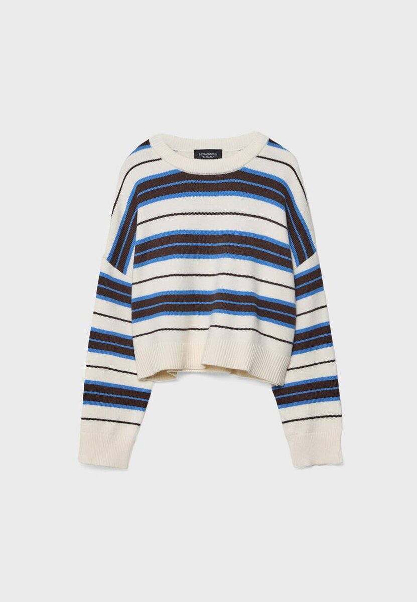 Krátký pletený svetr s pruhy. Kulatý výstřih a dlouhé rukávy. Žebrované lemy. K dispozici v různých barvách.