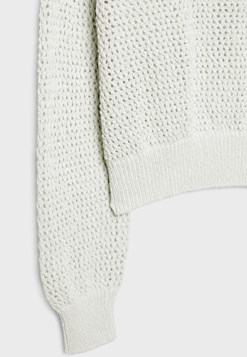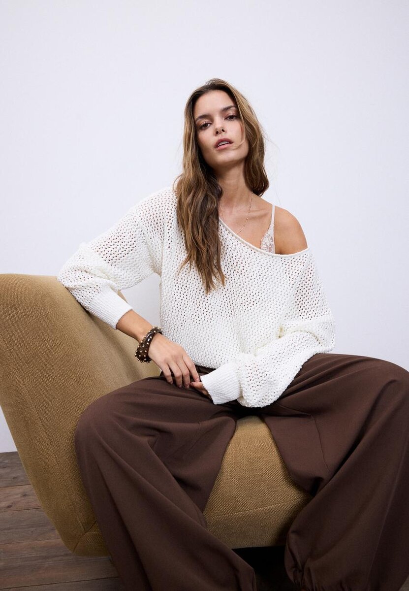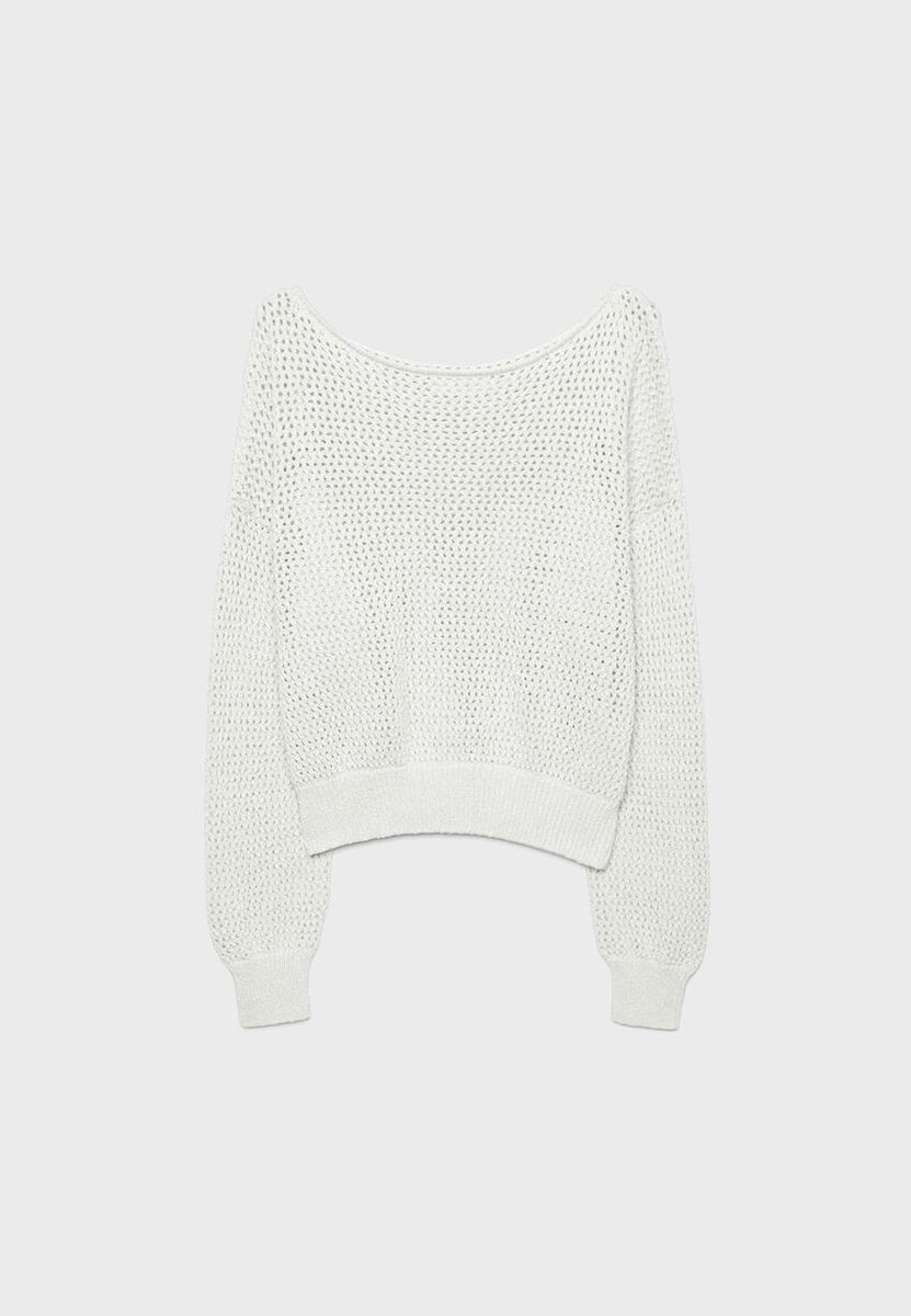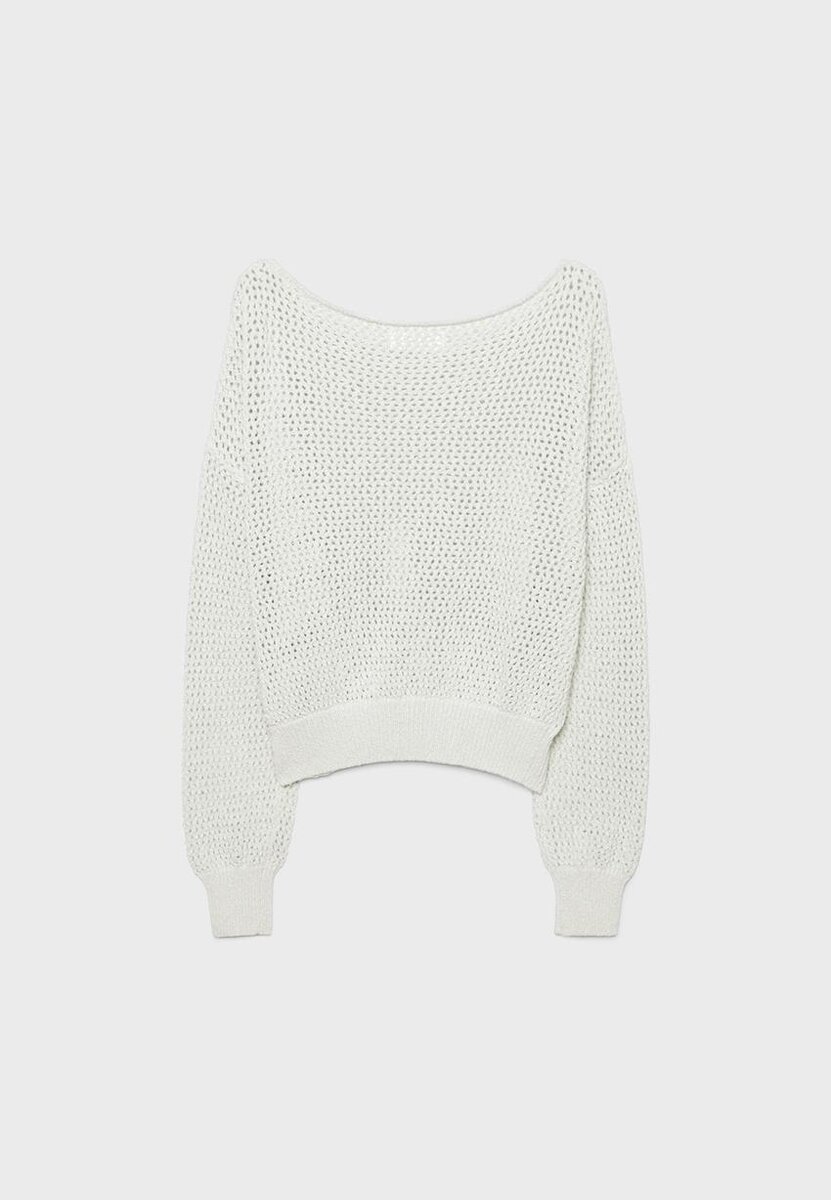 Síťovaný svetr s výstřihem do lodičky a žebrovaným lemem. K dispozici v různých barvách.