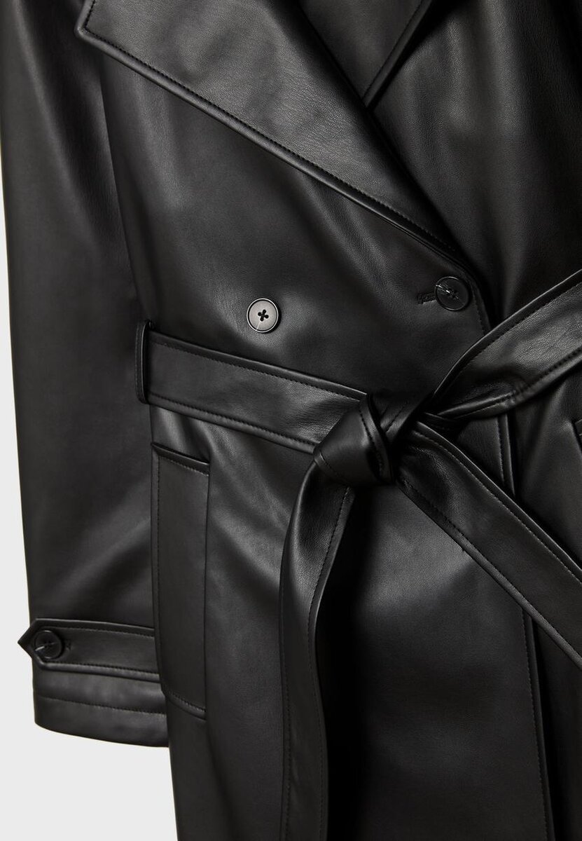 Dlouhý trenčkot s efektem kůže, s klopovým límcem, dlouhými rukávy s poutky, bočními kapsami s lemováním, odnímatelným páskem ze stejné látky a zapínáním na knoflíky vpředu. K dispozici v několika barvách.