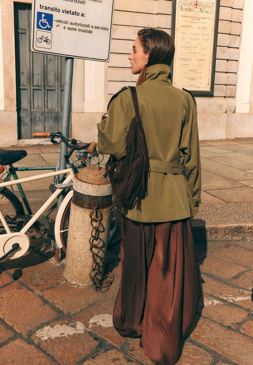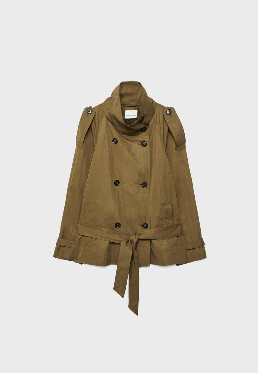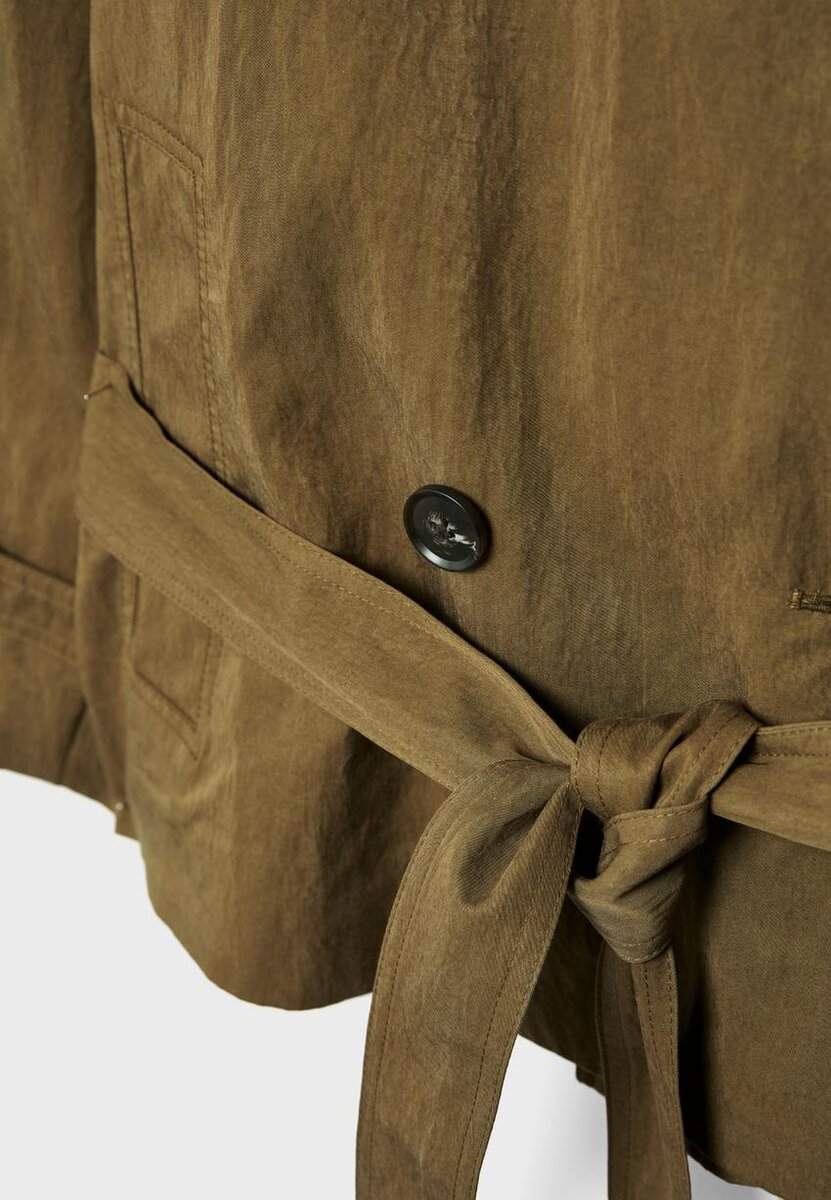 Krátký splývavý trenčkot s klopovým límcem a dlouhými rukávy s poutkem a knoflíkem. Boční kapsy. Dvouřadé zapínání na knoflíky vpředu a vázací pásek.