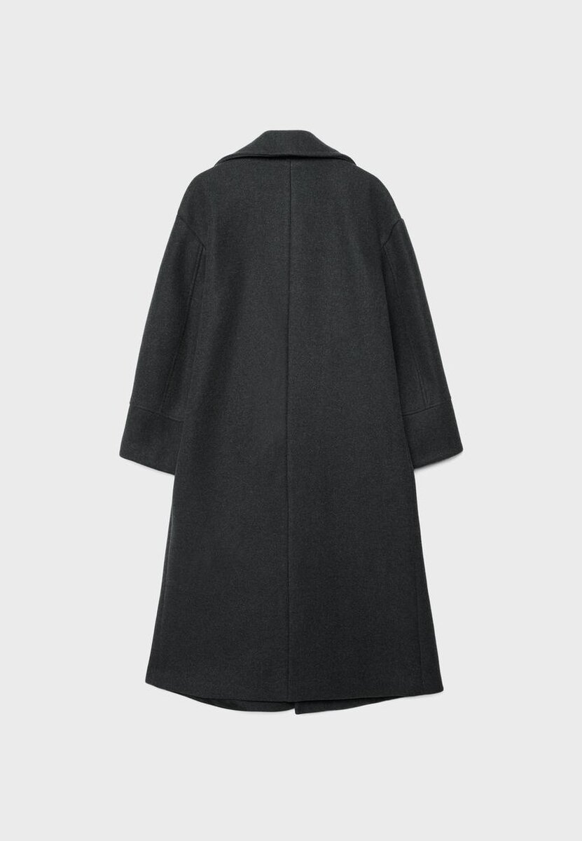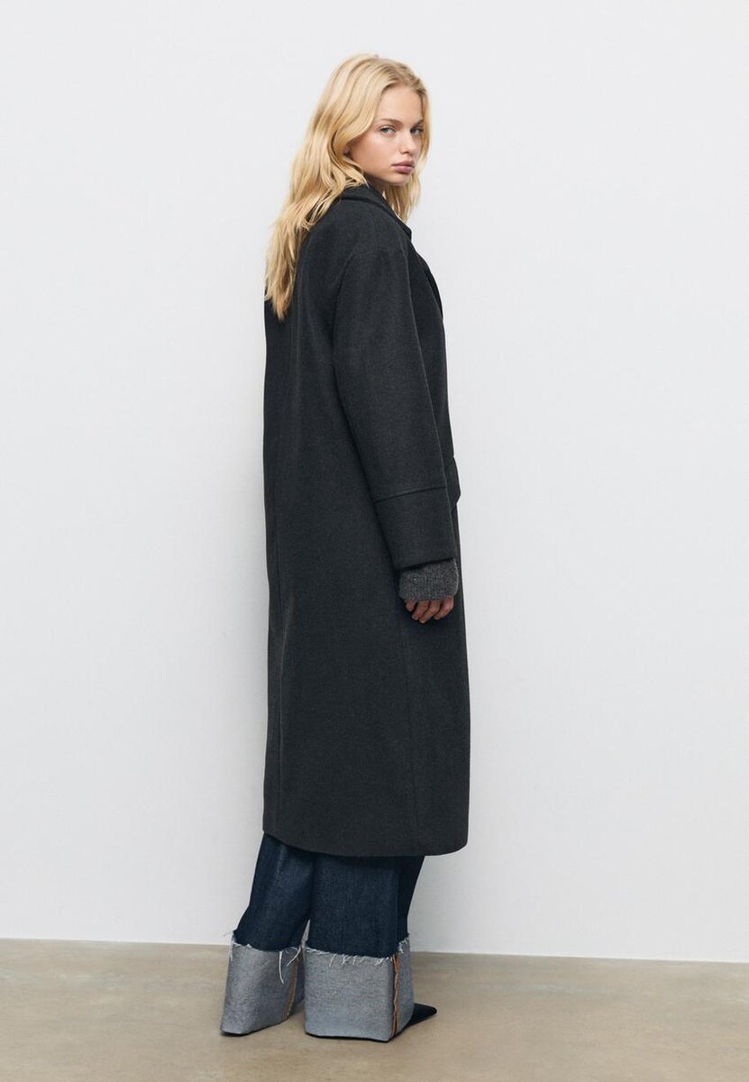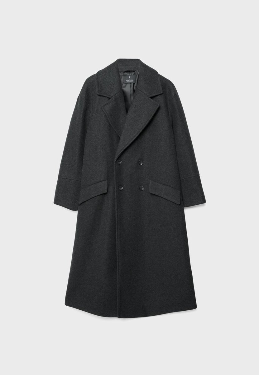 Oversize kabát s jemným povrchem na dotek, klopovým límcem a dlouhými rukávy. Falešné přední kapsy. Dvouřadé zapínání s kontrastními knoflíky.
