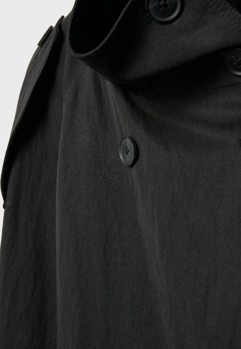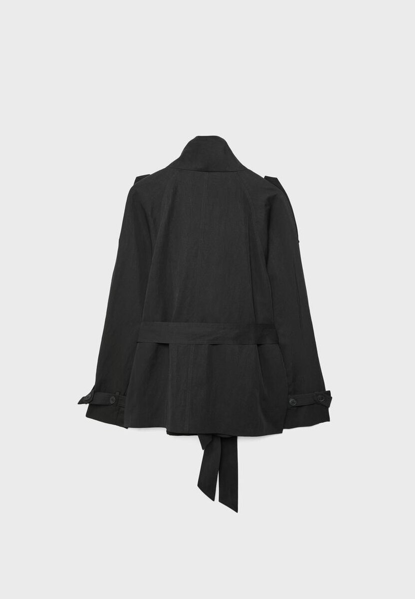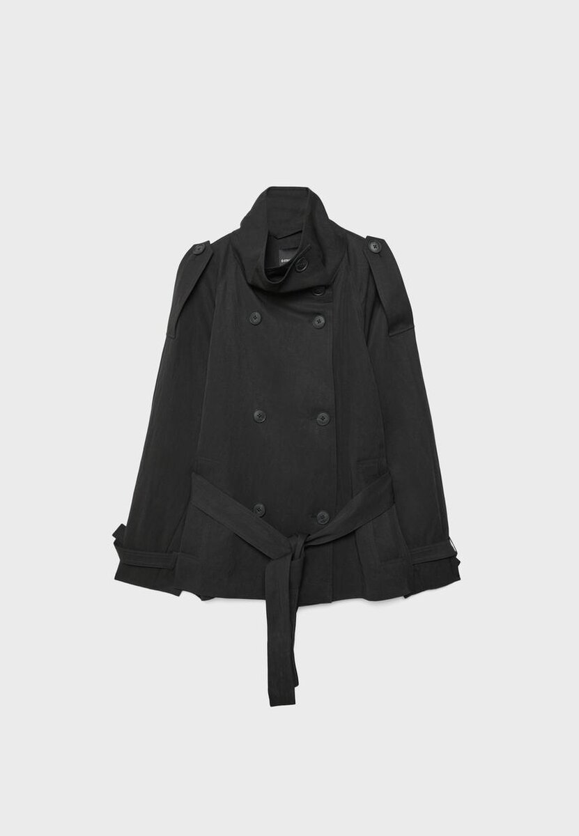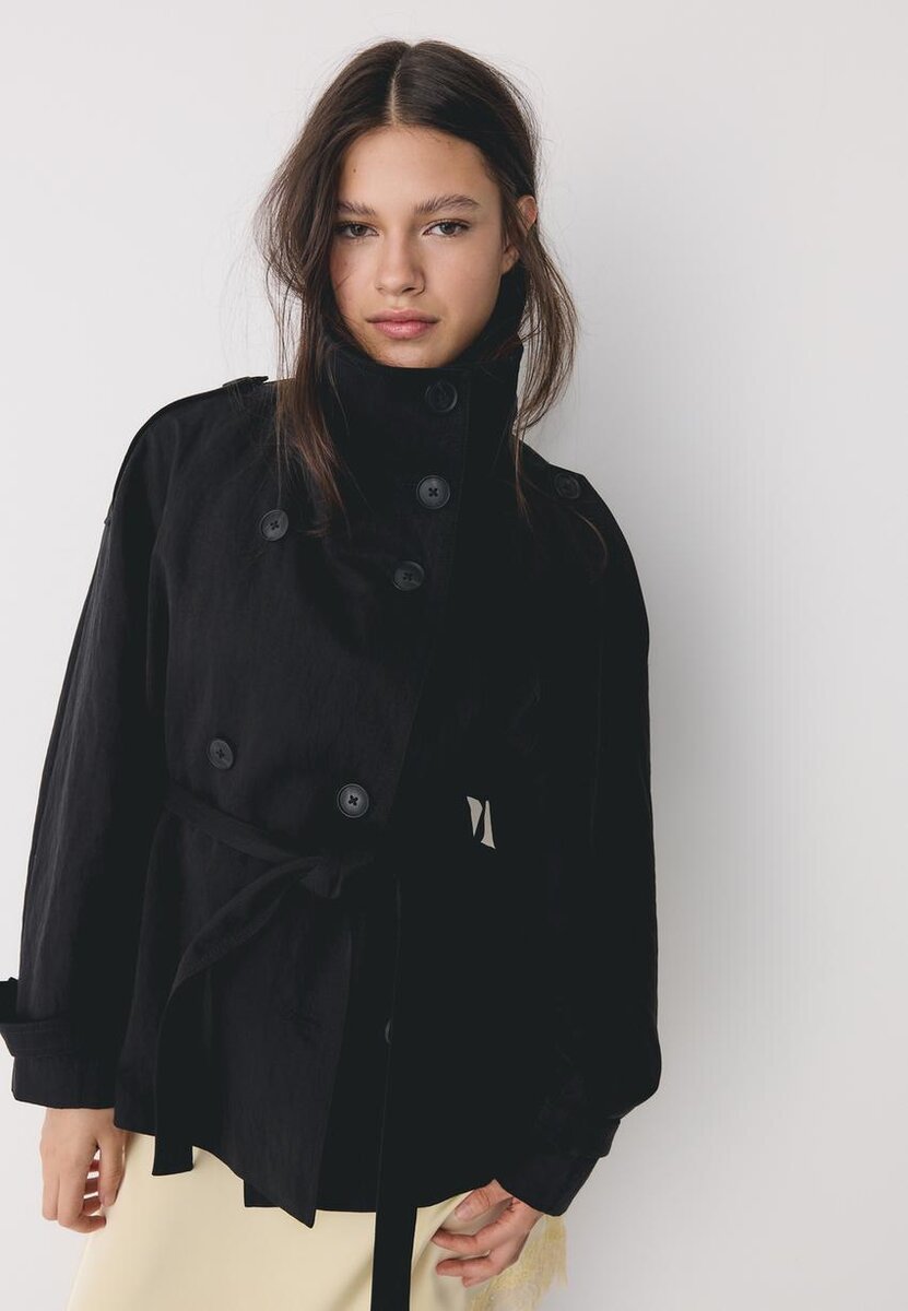 Krátký trenchcoat s vysokým límcem a dlouhými rukávy s detaily v podobě poutka a knoflíků. Boční kapsy. Dvouřadé zapínání na knoflíky a ladící pásek. K dispozici v několika barvách.