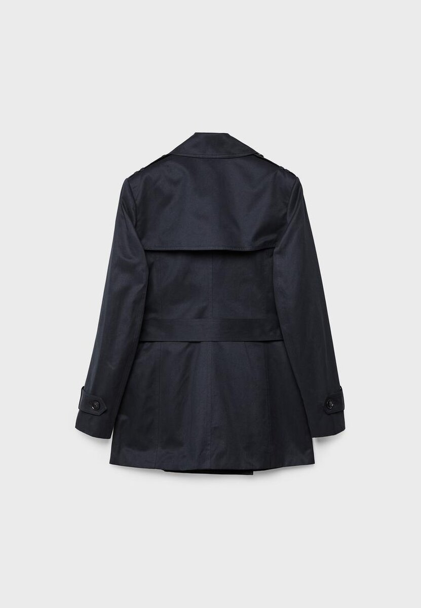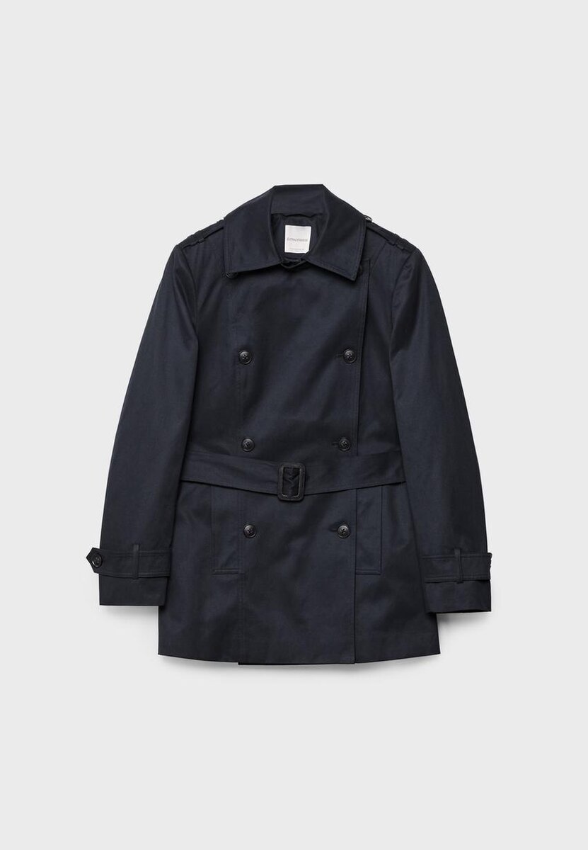 Krátký trenčkot s klopovým límcem a dlouhými rukávy s knoflíkovými manžetami. S předními kapsami, dvouřadým zapínáním na knoflíky a ladícím látkovým páskem.