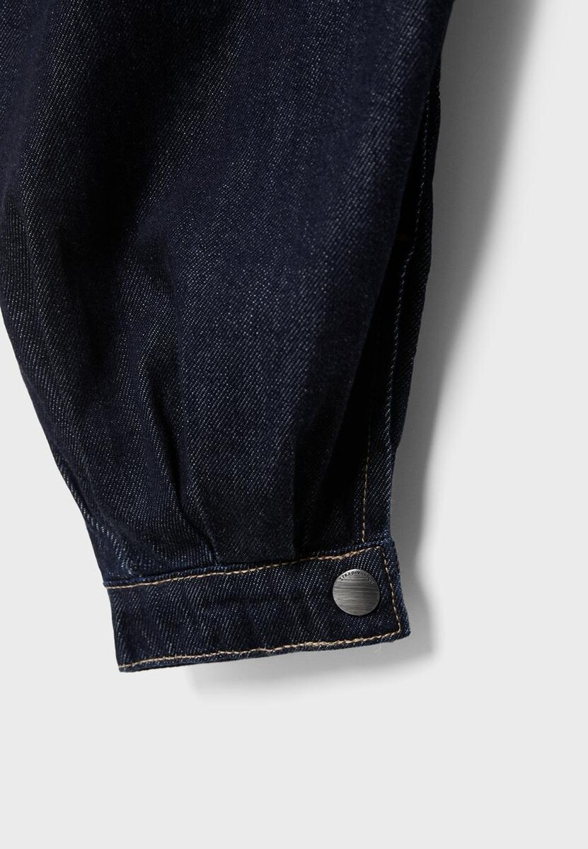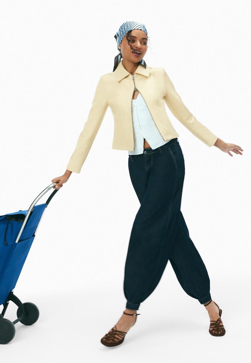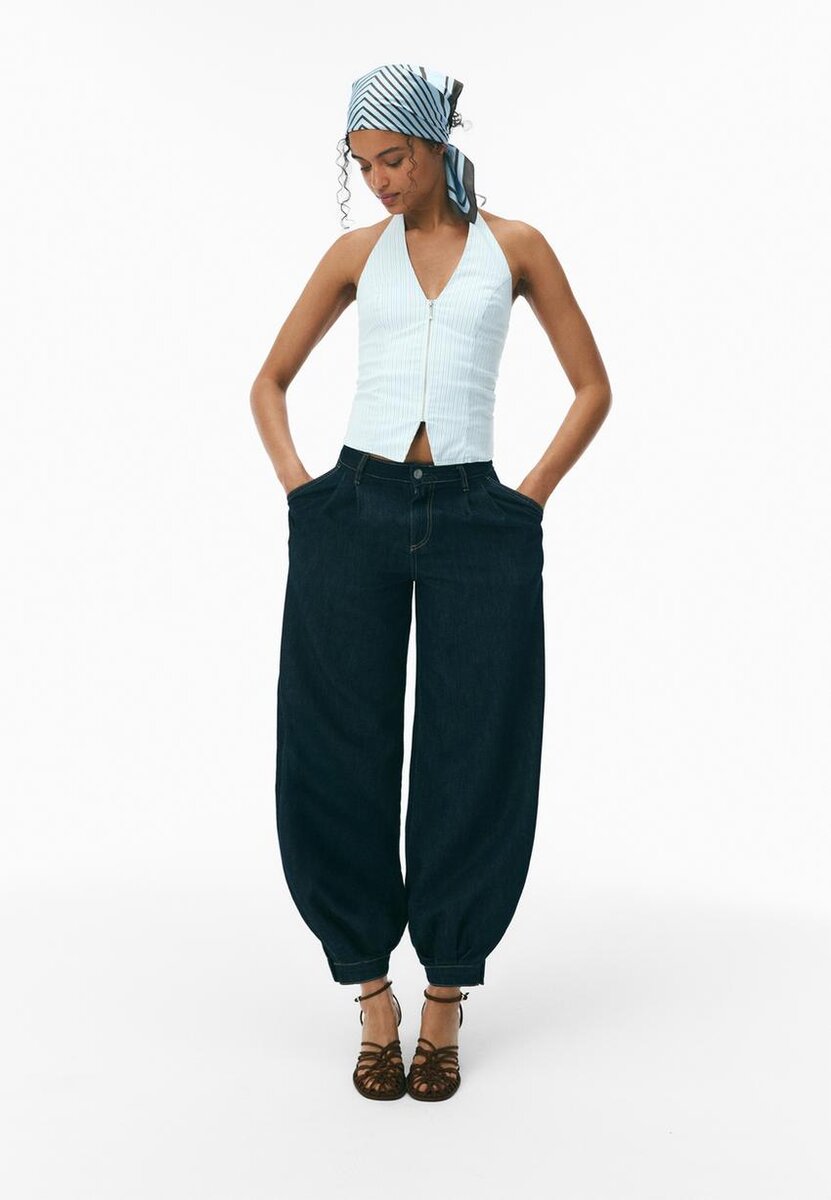 Džínové kalhoty se středním pasem, zapínáním na zip a knoflíky vpředu. Balónový lem. Přední a zadní kapsy.