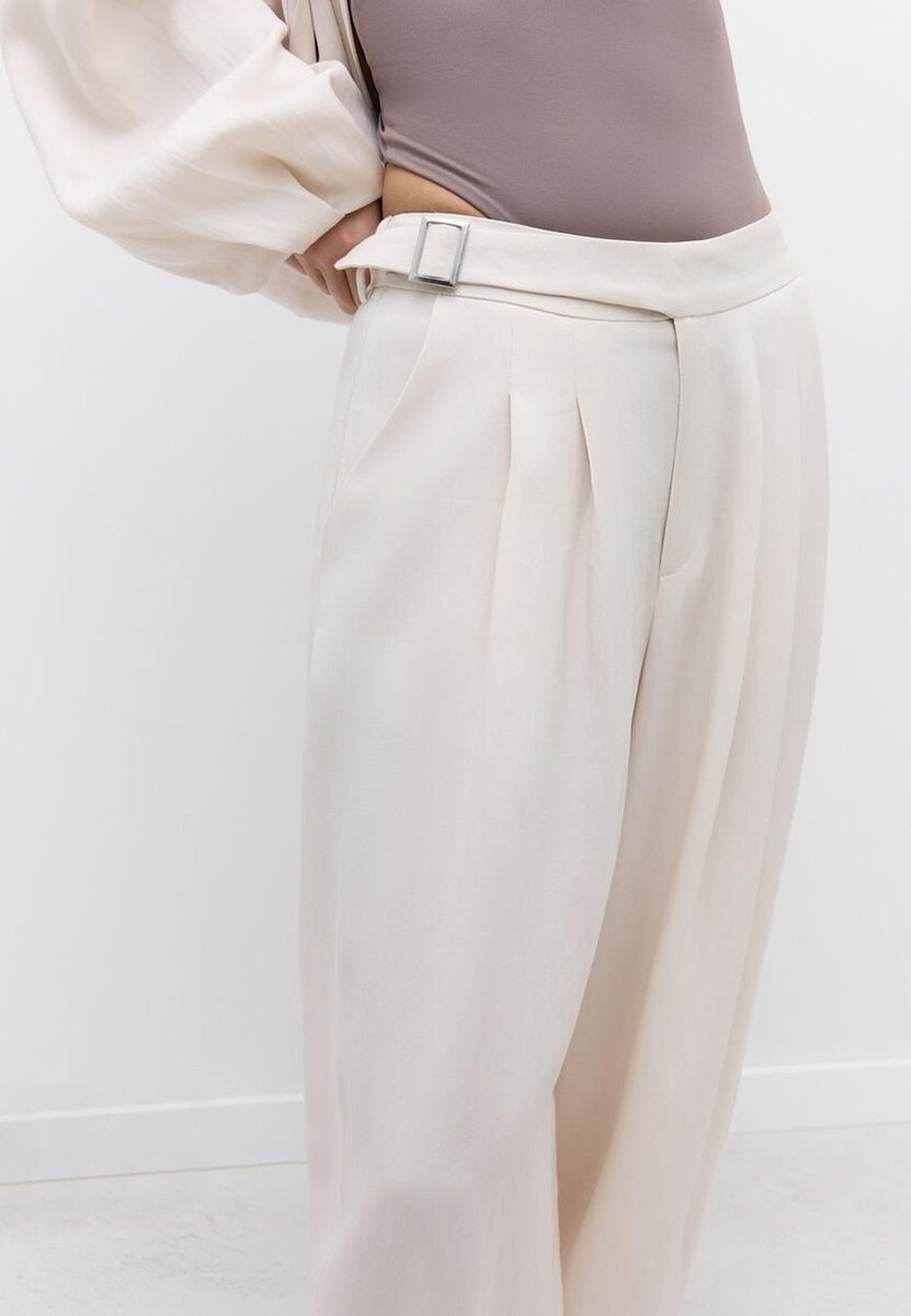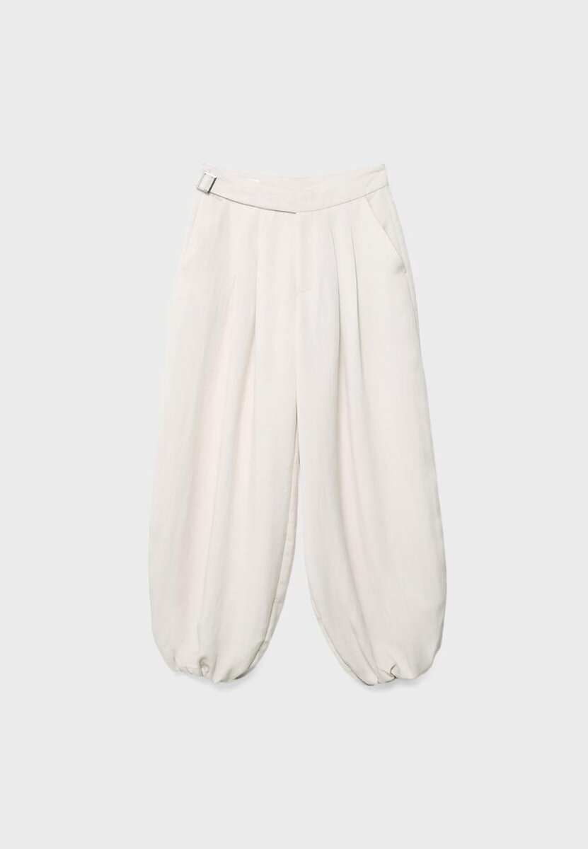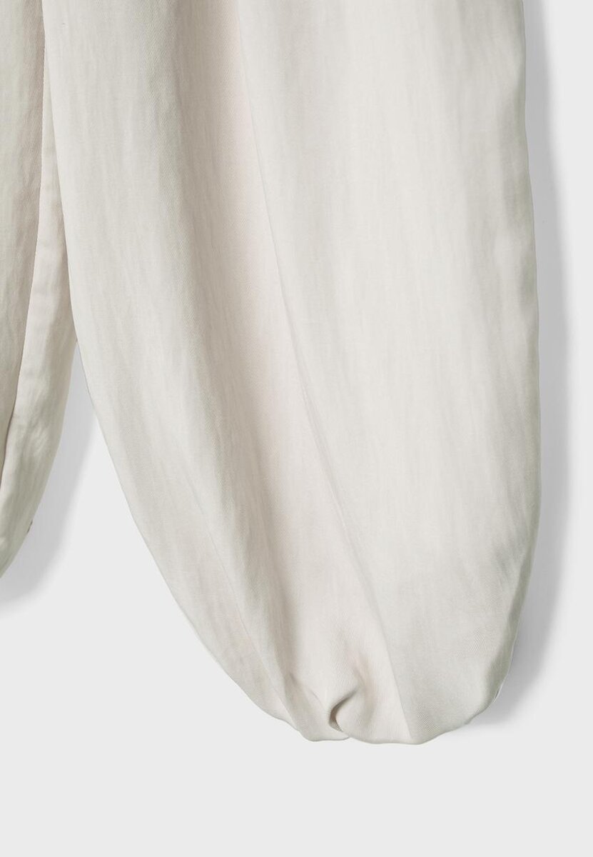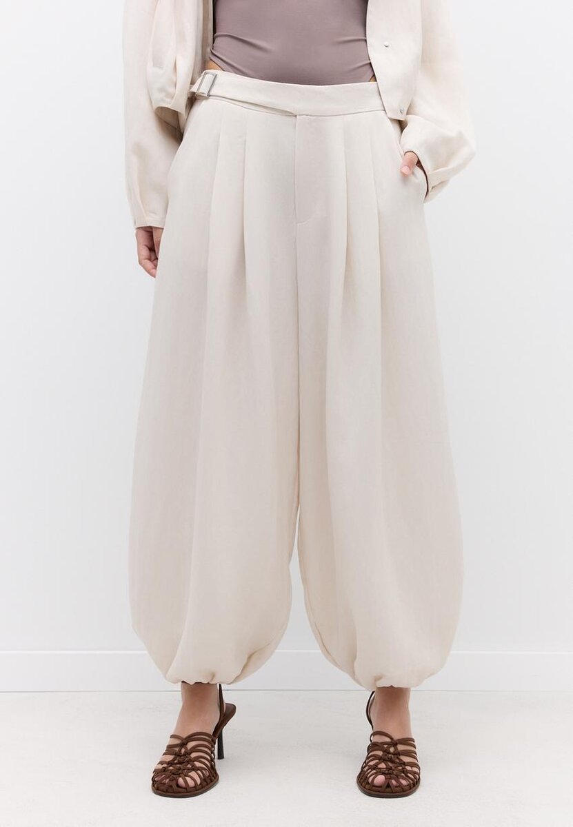 Kalhoty s balónovým střihem vyrobené z volně splývající směsi lyocellu a viskózy. Vysoký pas s nastavitelnými bočními poutky na opasek a kovovou sponou. Boční kapsy. Široké, nafouklé nohavice s elastickými lemy. Přední záševky. Přední zapínání na zip a vnitřní knoflíky.