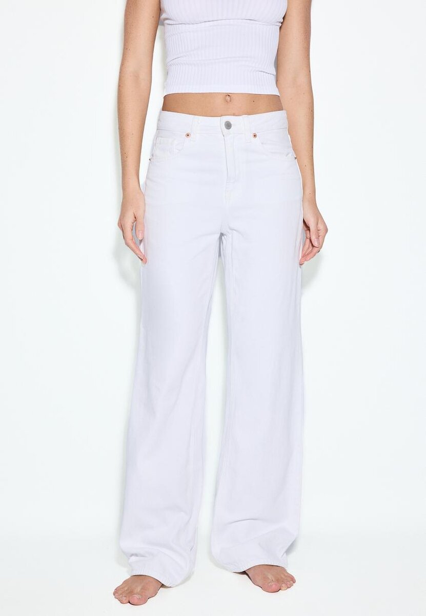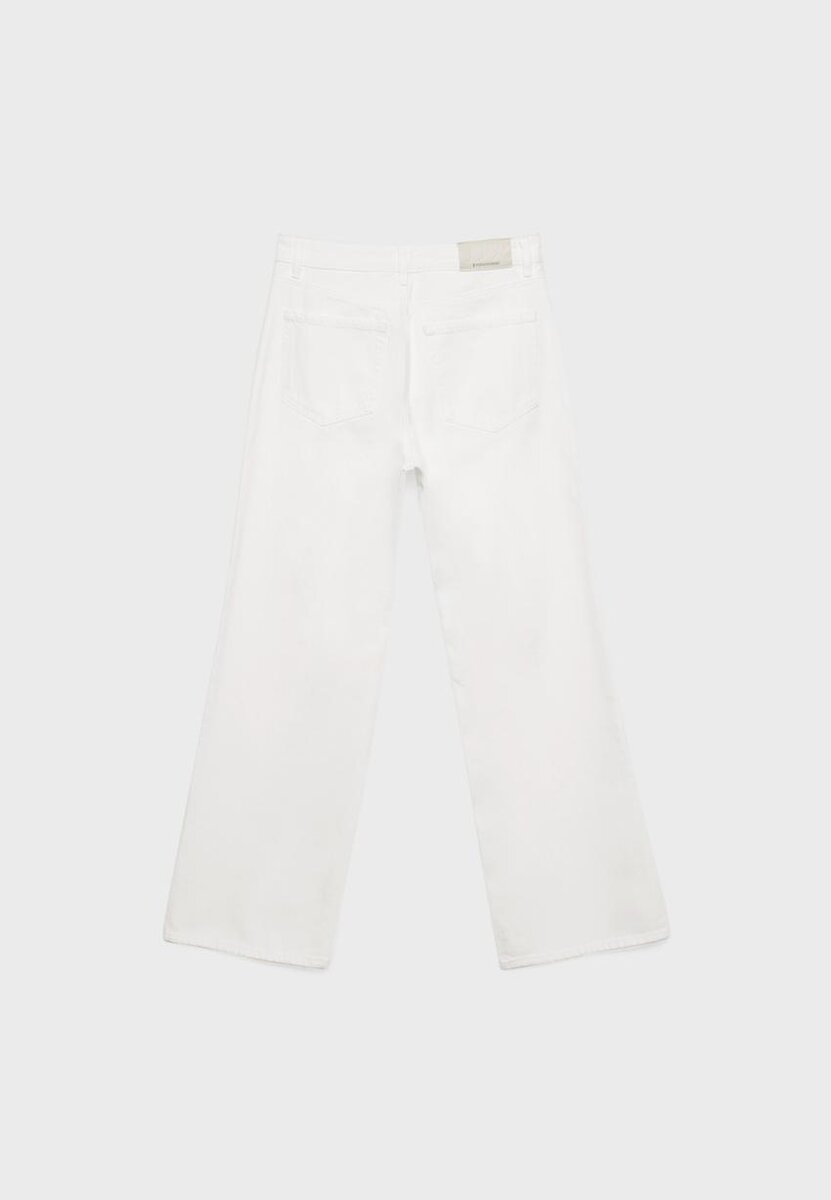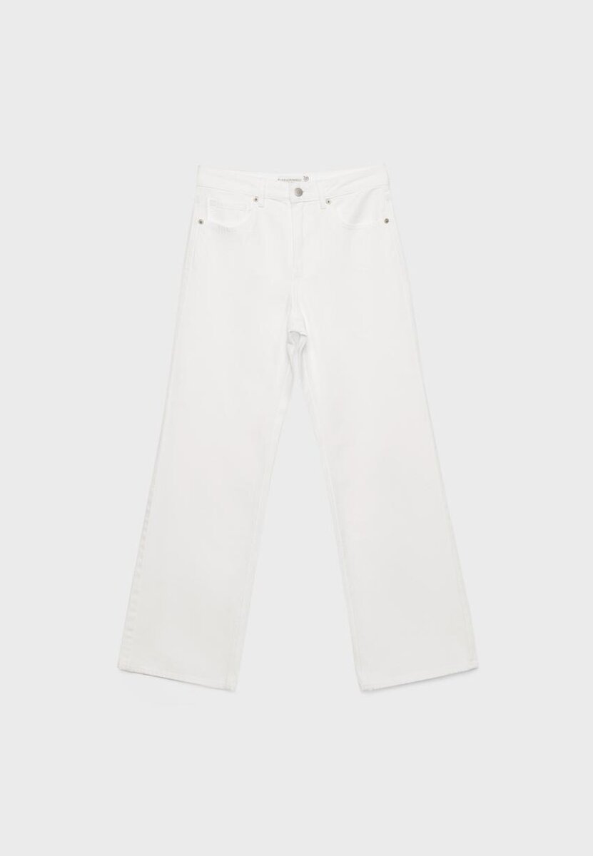 Rovné džíny s vysokým pasem a širokými nohavicemi, s předními kapsami. Nášivkové kapsy na zadní straně. Pas s poutky na pásek. Rovný, Wide Leg střih. Zapínání na zip vpředu a kovový knoflík. K dispozici v různých barvách.