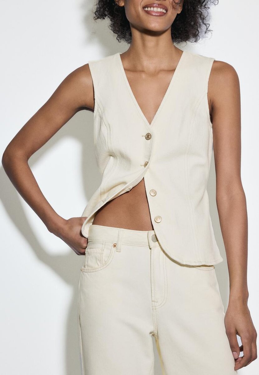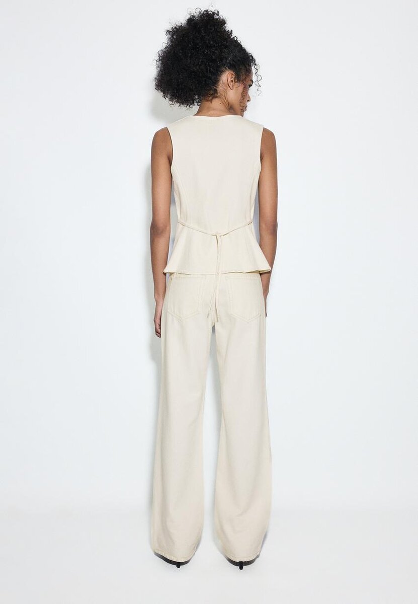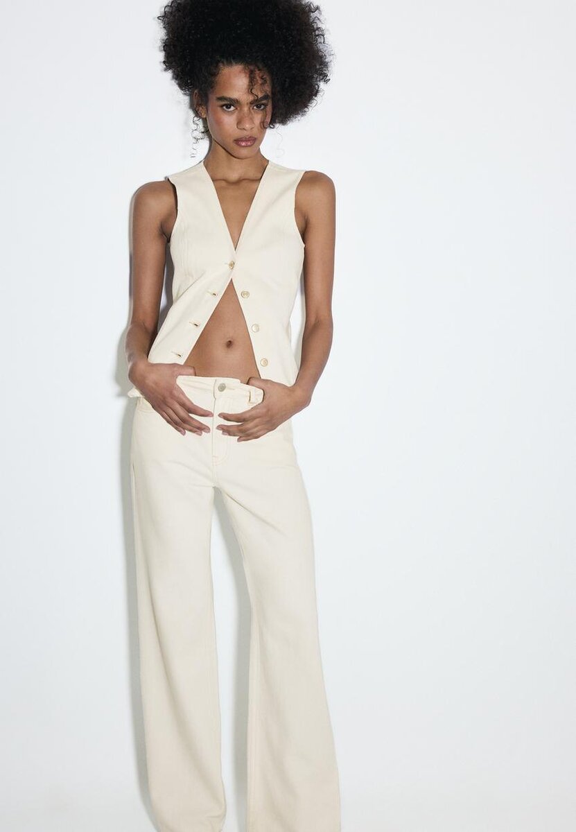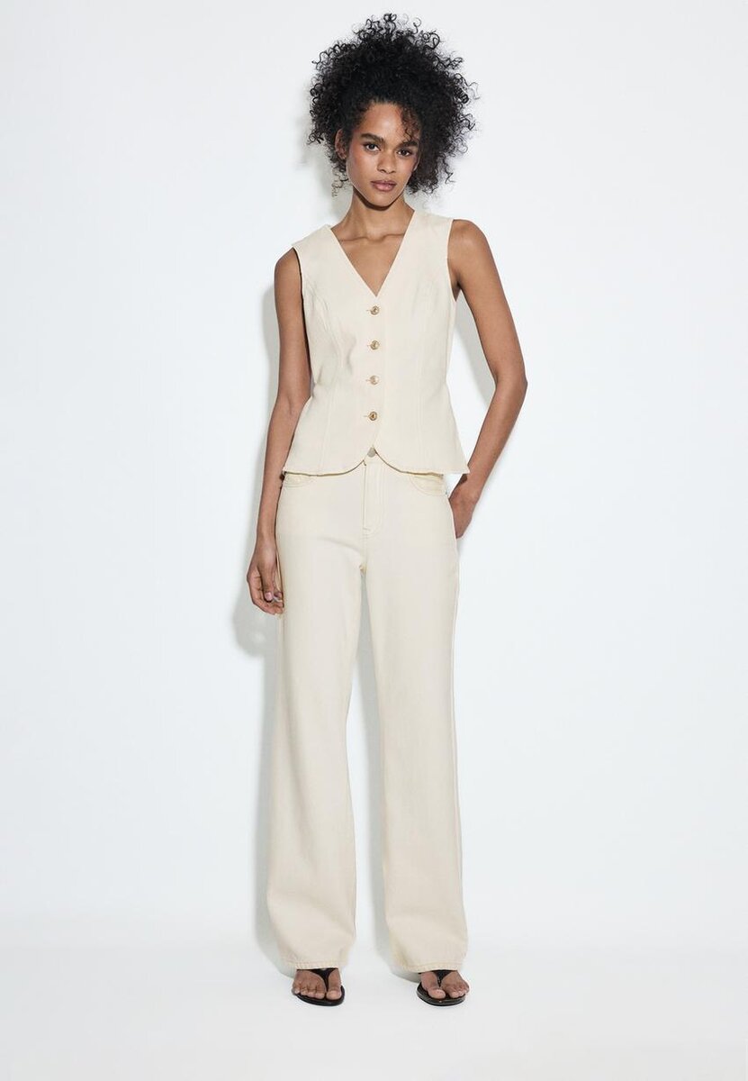 Džíny s vysokým pasem, rovným střihem a širokými nohavicemi, s předními kapsami. Nášivkové kapsy na zadní straně. Pas s poutky na pásek. Rovný, Wide Leg. Zapínání na zip vpředu a kovové knoflíky. K dispozici v různých barvách.