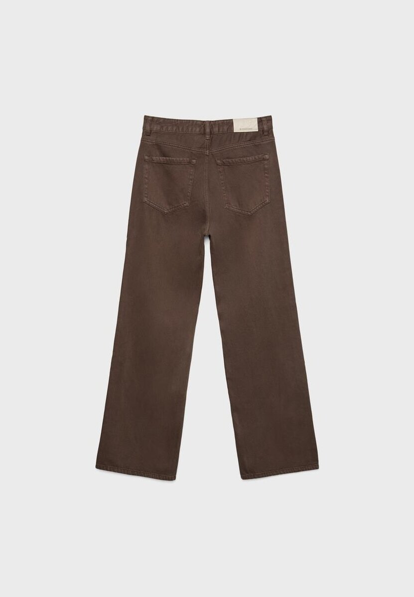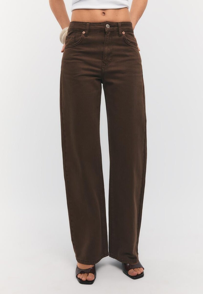 Rovné džíny s vysokým pasem a širokými nohavicemi, s předními kapsami. Nášivkové kapsy na zadní straně. Pás s poutky na opasek. Rovný, Wide Leg střih. Zapínání na zip vpředu a kovový knoflík. K dispozici v různých barvách.