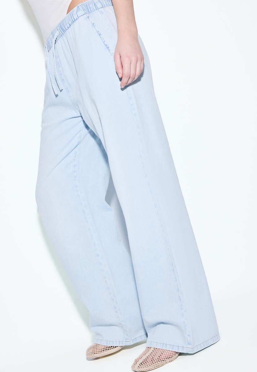 Volné džínové kalhoty se středním pasem a nastavitelným elastickým pasem s ladícími stahovacími šňůrkami. Boční kapsy. Široké, rovné nohavice. K dispozici v různých barvách.