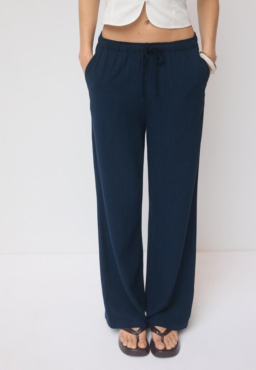Kalhoty s vysokým pasem z materiálu s efektem lnu. S bočními kapsami a záhyby vpředu. Zapínání na knoflík a zip.