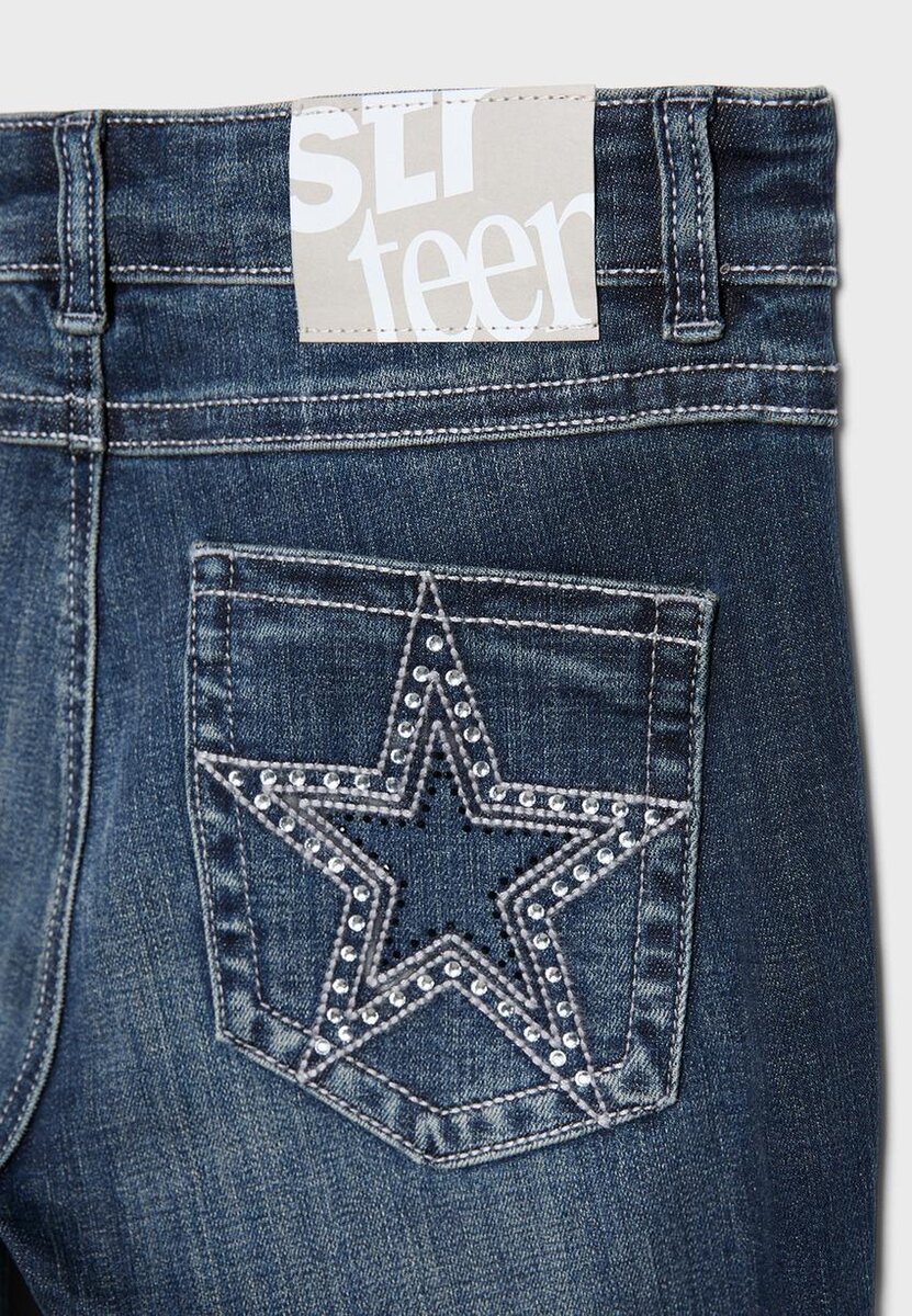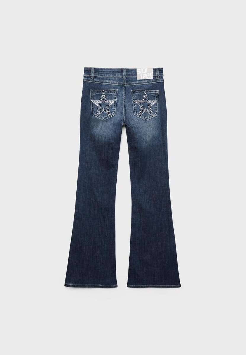 Džíny se zvonovými nohavicemi a nízkým pasem s poutky na pásek. Mají přední kapsy a našité kapsy s klopou a knoflíkem na zadní straně. Rozšířený lem. Zapínání na zip vpředu a dvojitý kovový knoflík. Vyšívané detaily a kamínky na zadních kapsách.