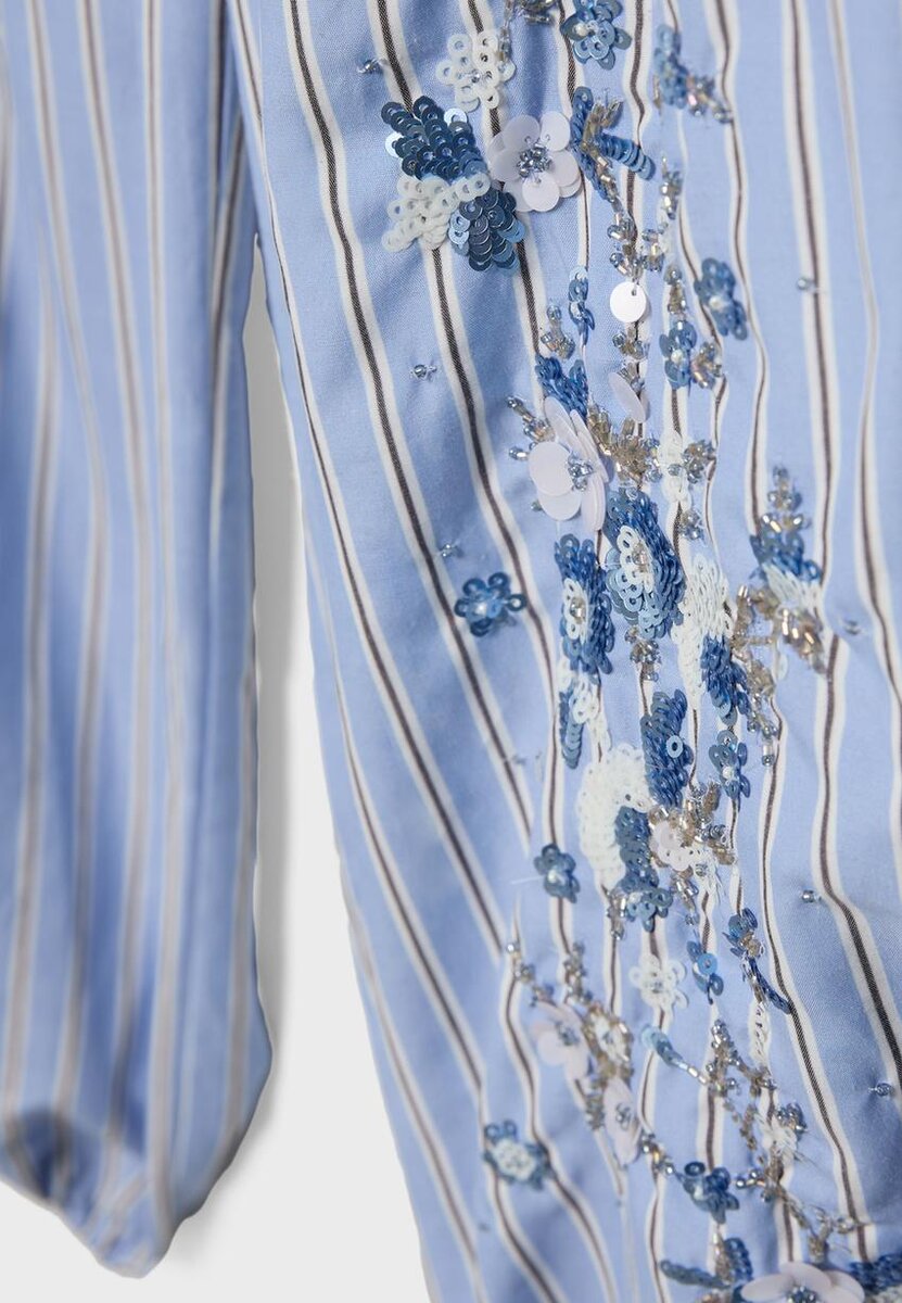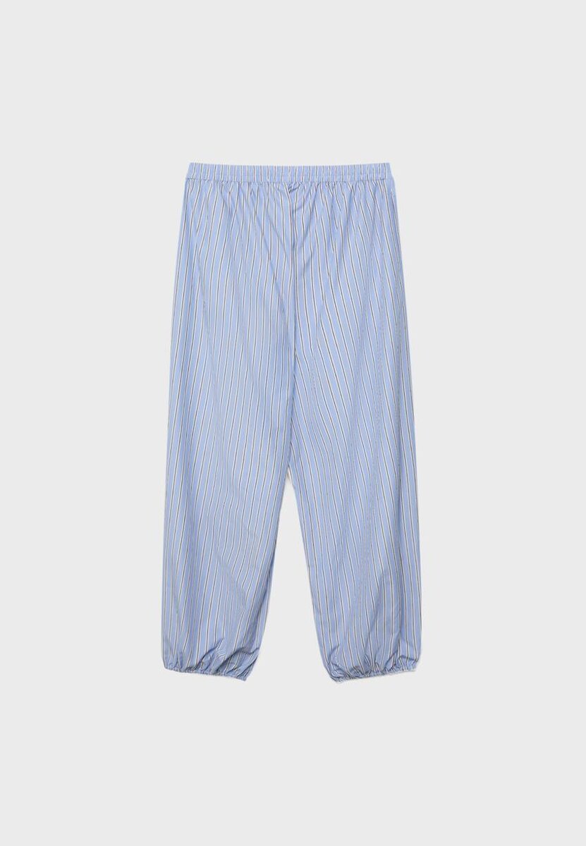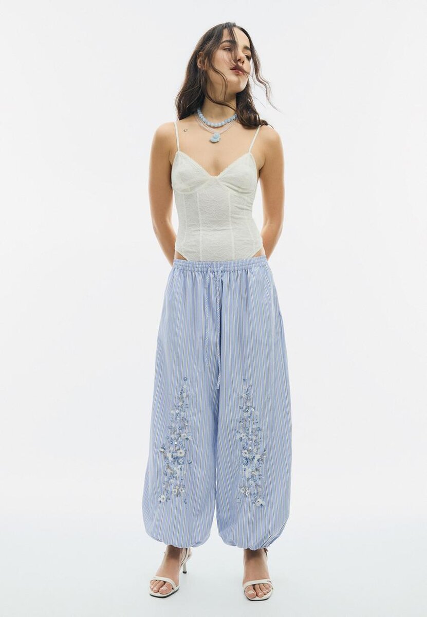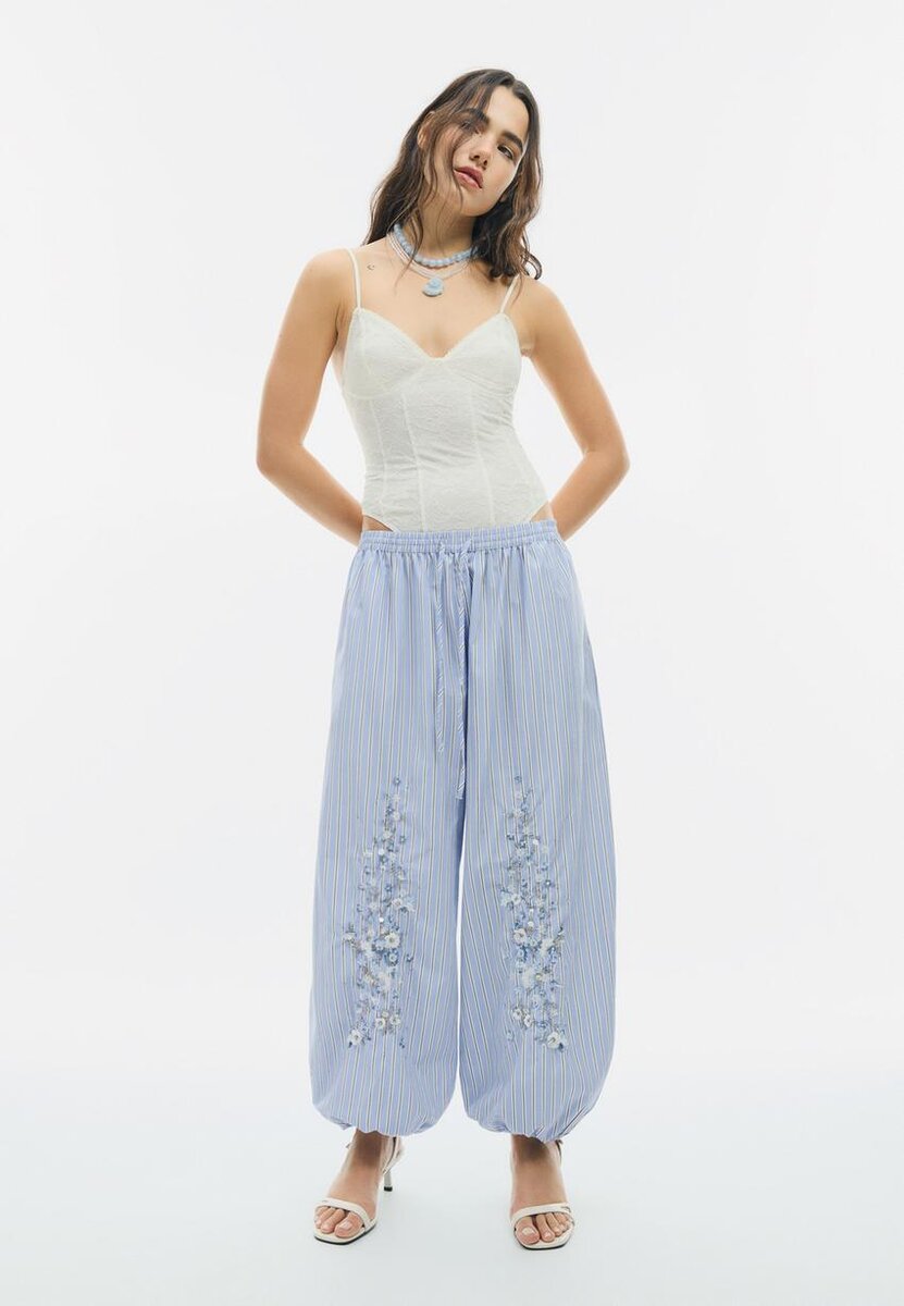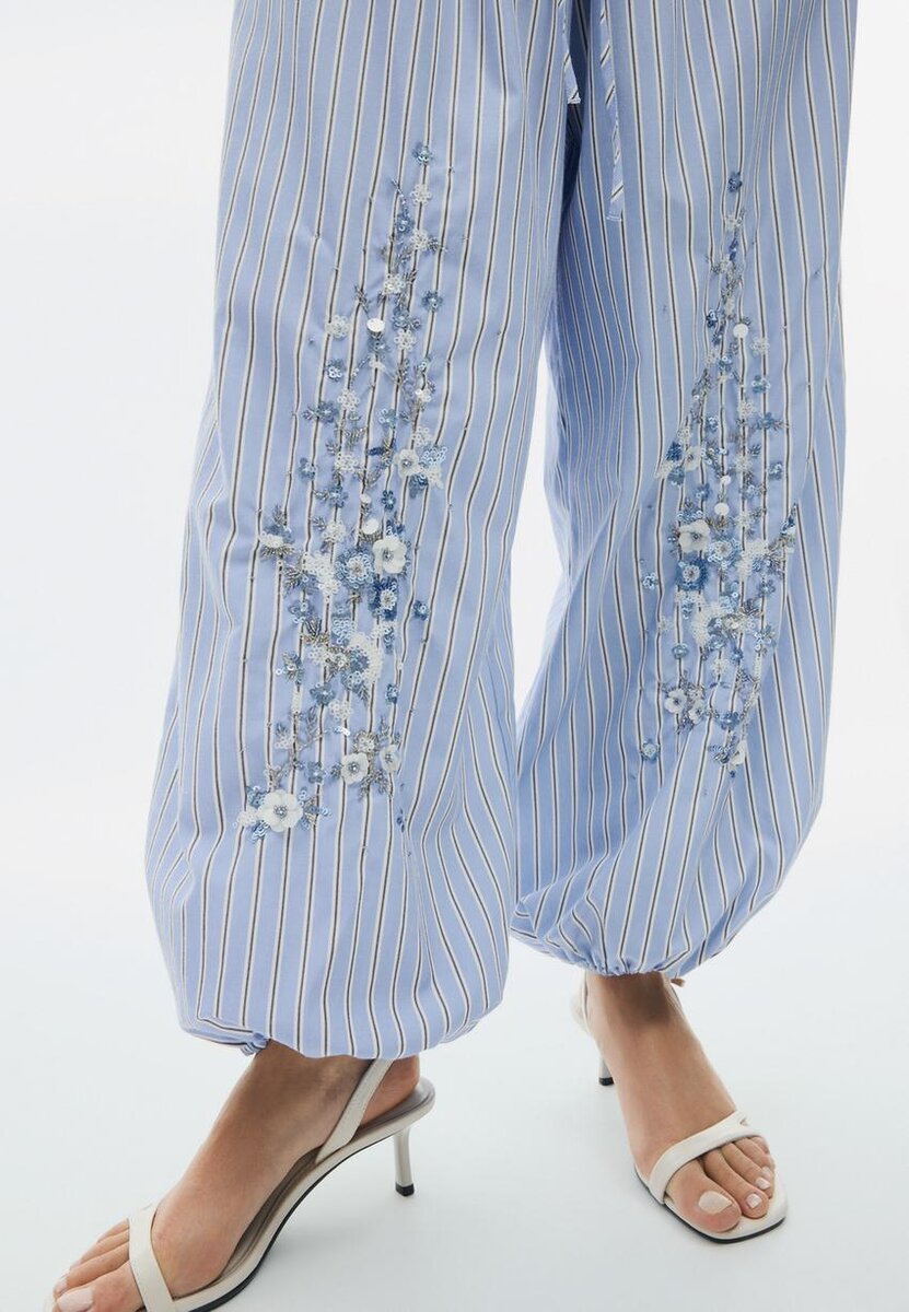 Krátké Balloon Fit kalhoty z pruhované bavlněné látky. S polopřirozeným pasem a elastickým stahovacím pasem. Wide Leg s elastickými manžetami. Výšivka z flitrů na lemu.