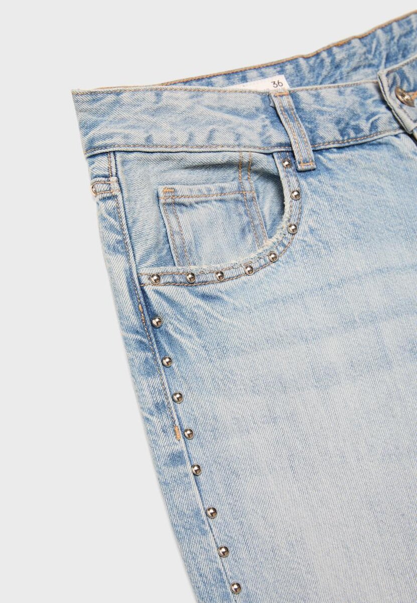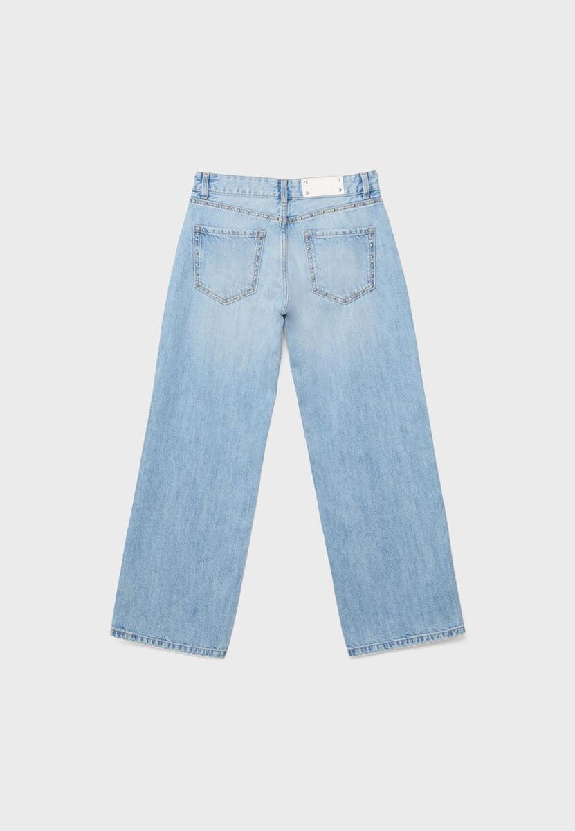 Džíny s nízkým pasem, pasovým lemem a poutky na opasek. S předními kapsami a zadními našitými kapsami. Rovný střih se širokými nohavicemi. Zapínání vpředu na kovový knoflík. Nýtky na bocích a kapsách.