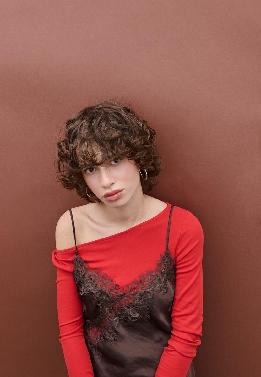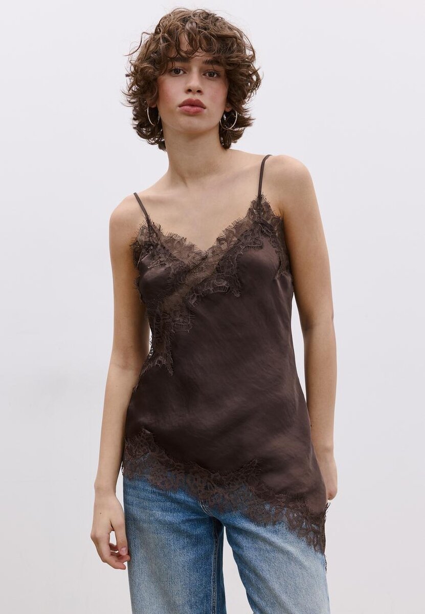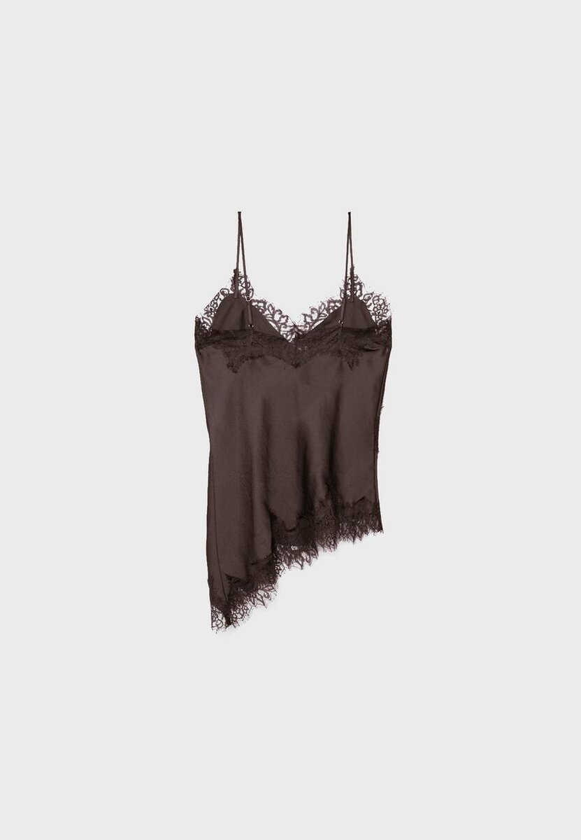 Spodní prádlo vyrobené ze saténové látky. Má výstřih do V a tenká ramínka. Zdobený tón v tónu krajkovou aplikací. Asymetrický lem. K dispozici v různých barvách.