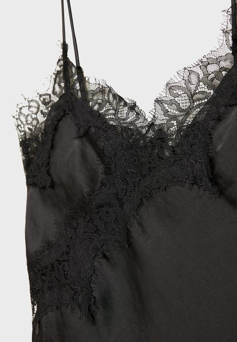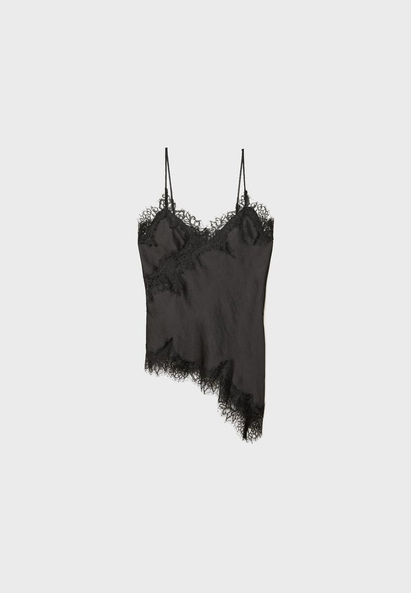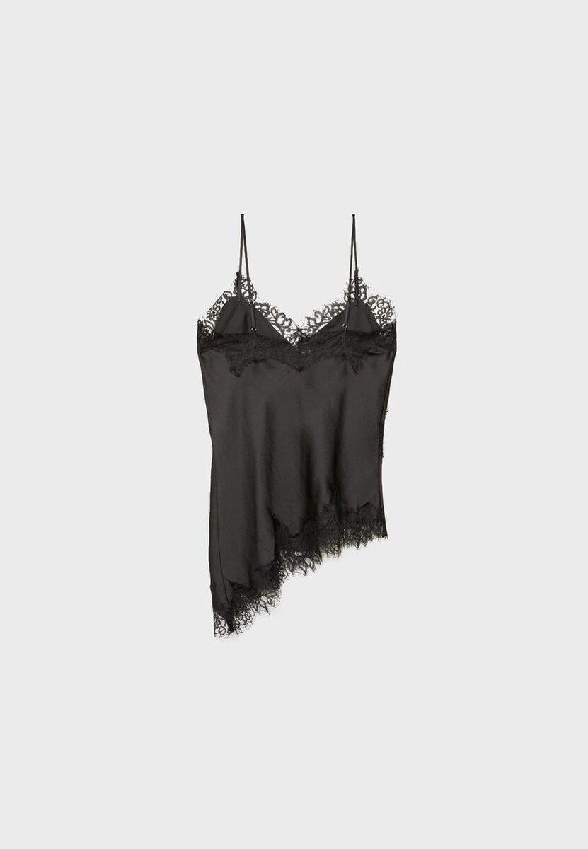 Tílko z saténové látky. S výstřihem do V a tenkými ramínky. S ladícími krajkovými aplikacemi a asymetrickým lemem.