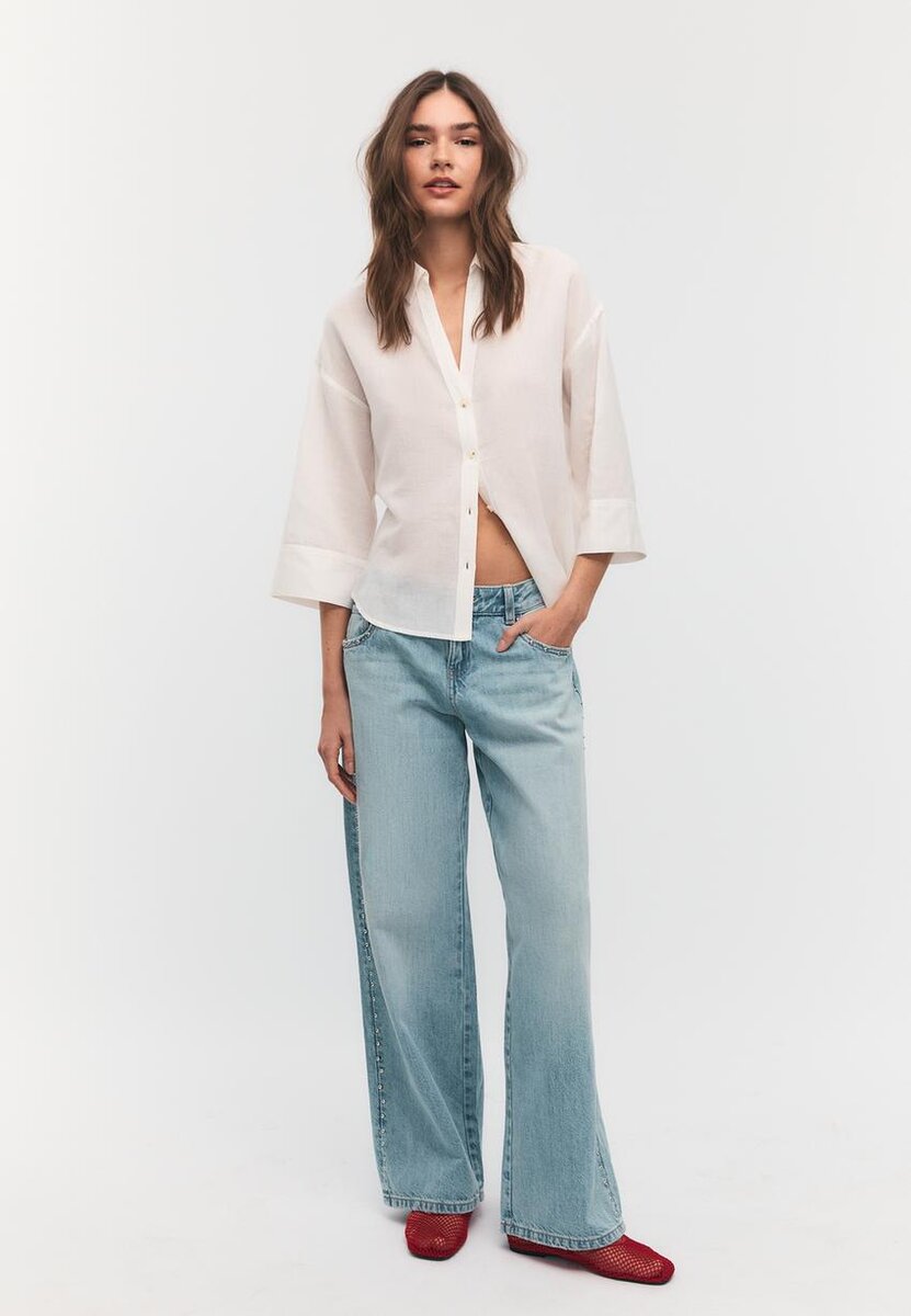 Košile vyrobená z látky obsahující 30 % lnu. Límec s klopami a kimono rukávy z látky v lněném vzhledu. Zapínání na knoflíky vpředu. K dispozici v několika barvách.