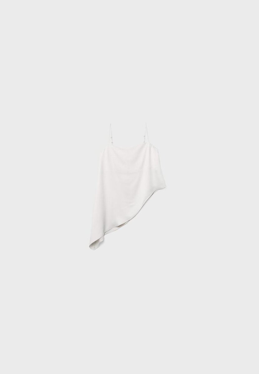 Saténový top s čtvercovým výstřihem a tenkými ramínky. Má asymetrický lem.