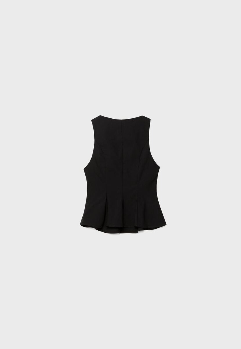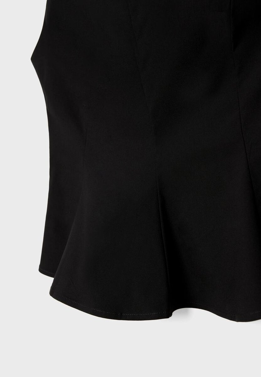 Přiléhavý top z pevné strečové tkaniny. Má kulatý výstřih a je bez rukávů. Se staženým pasem a volným volánkovým lemem. Skrytý boční zip.