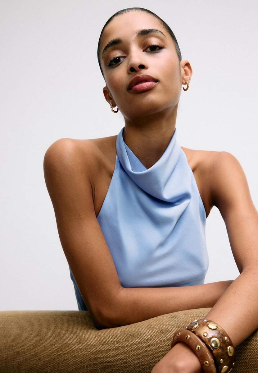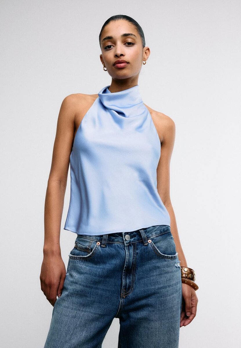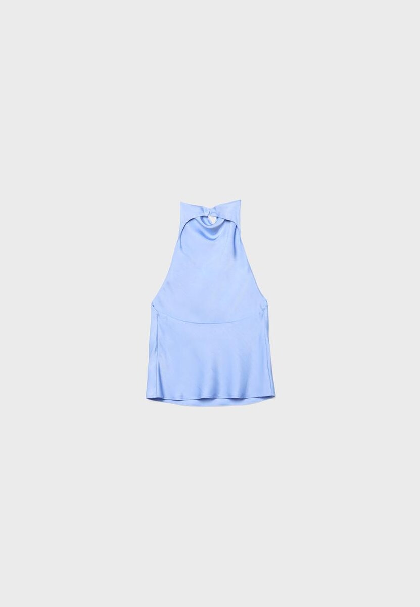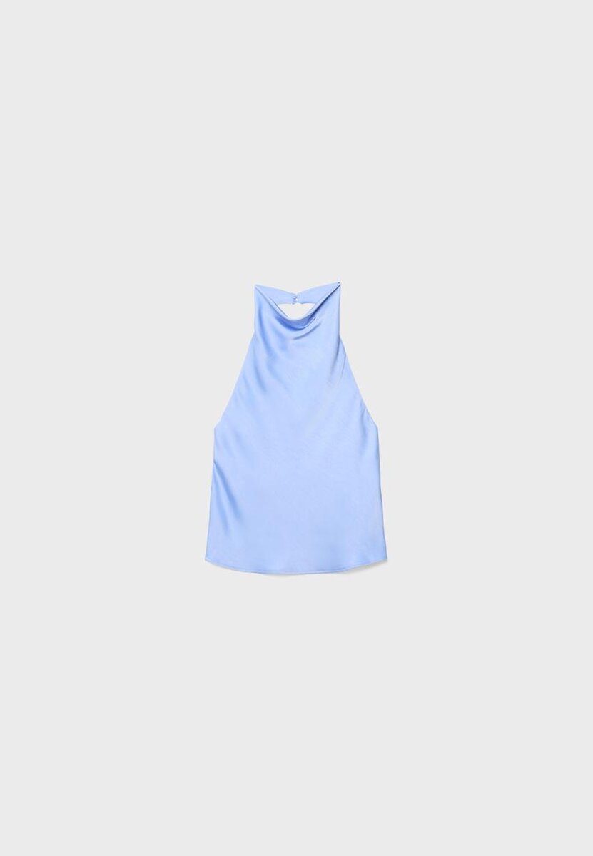 Top s halter výstřihem vyrobený z látky se saténovým efektem. Zapínání na knoflíky na zádech. K dispozici v různých barvách.