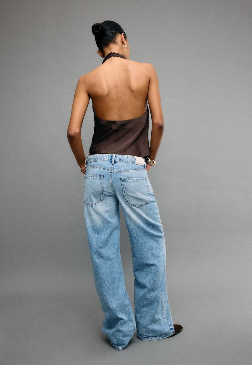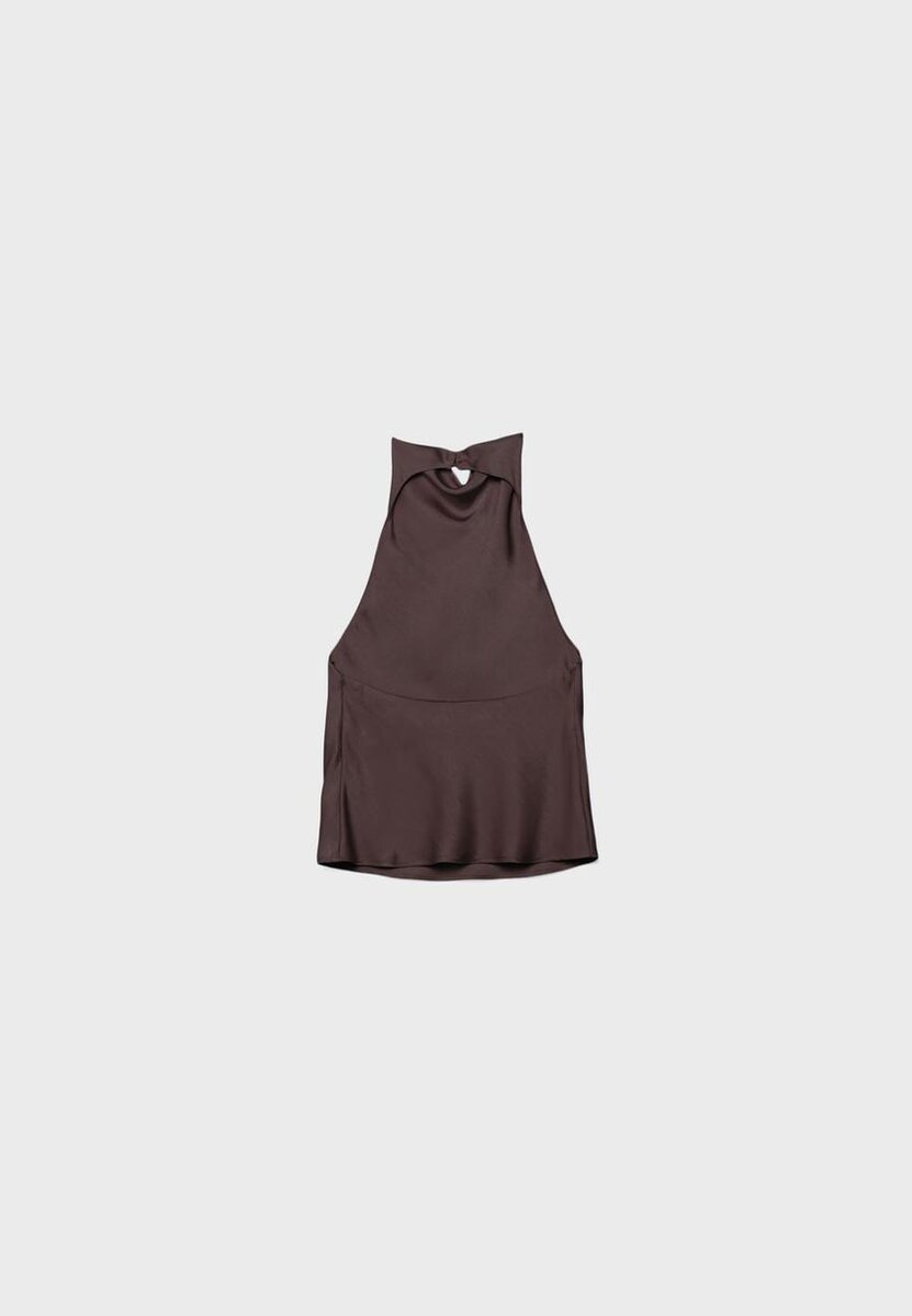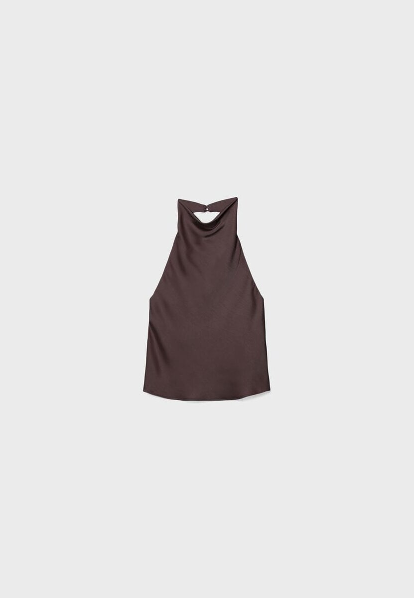 Top s výstřihem za krk vyrobený z látky se saténovým efektem. Zapínání na knoflíky na zádech.