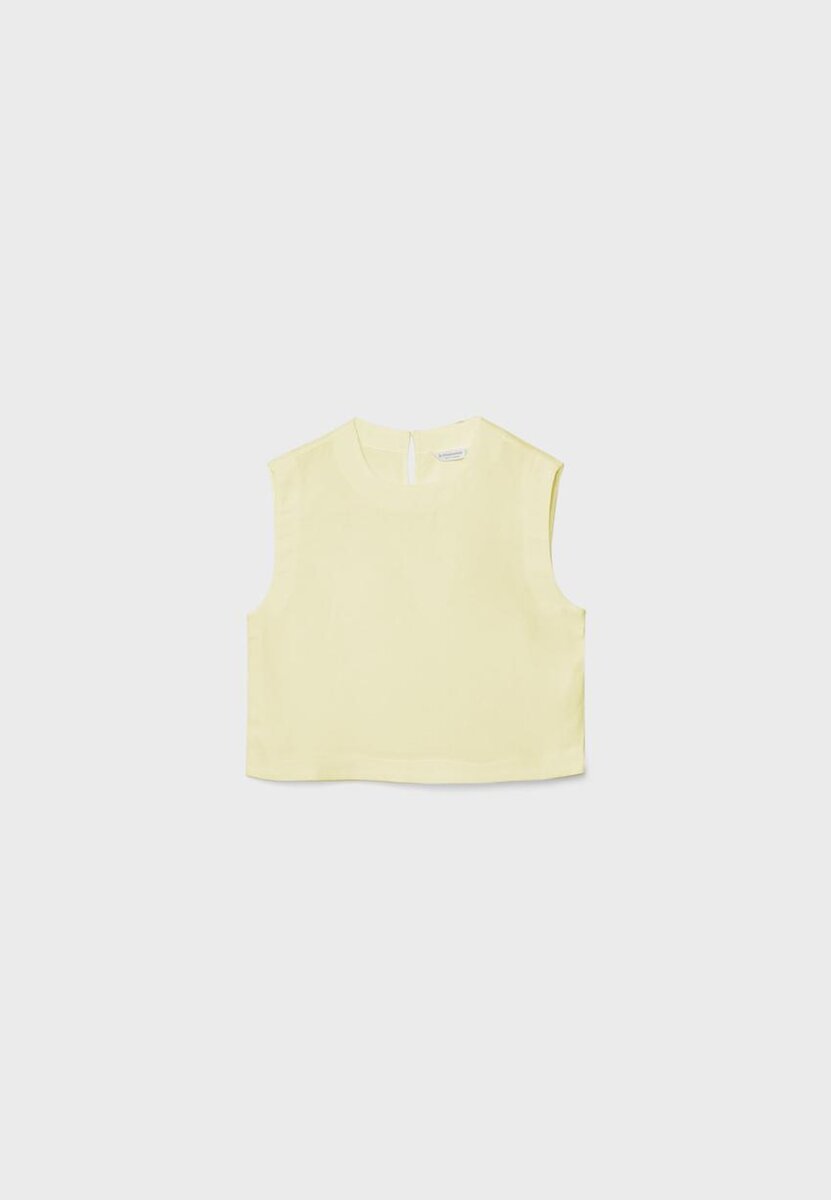 Top z rustikální látky s 18 % lnu. S kulatým výstřihem a bez rukávů. Zapínání na knoflíky s rozparkem na zádech. Rovný spodní okraj.