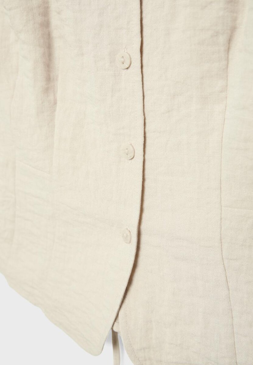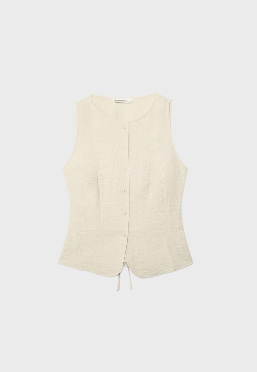 Vesta bez rukávů s kulatým výstřihem. Zapínání na knoflíky vpředu a nastavitelný stahovací pás vzadu. K dispozici v různých barvách.