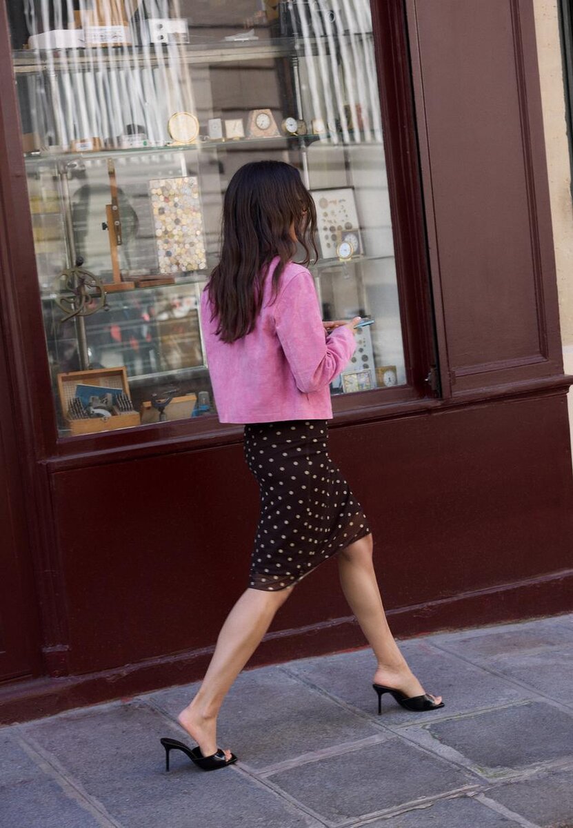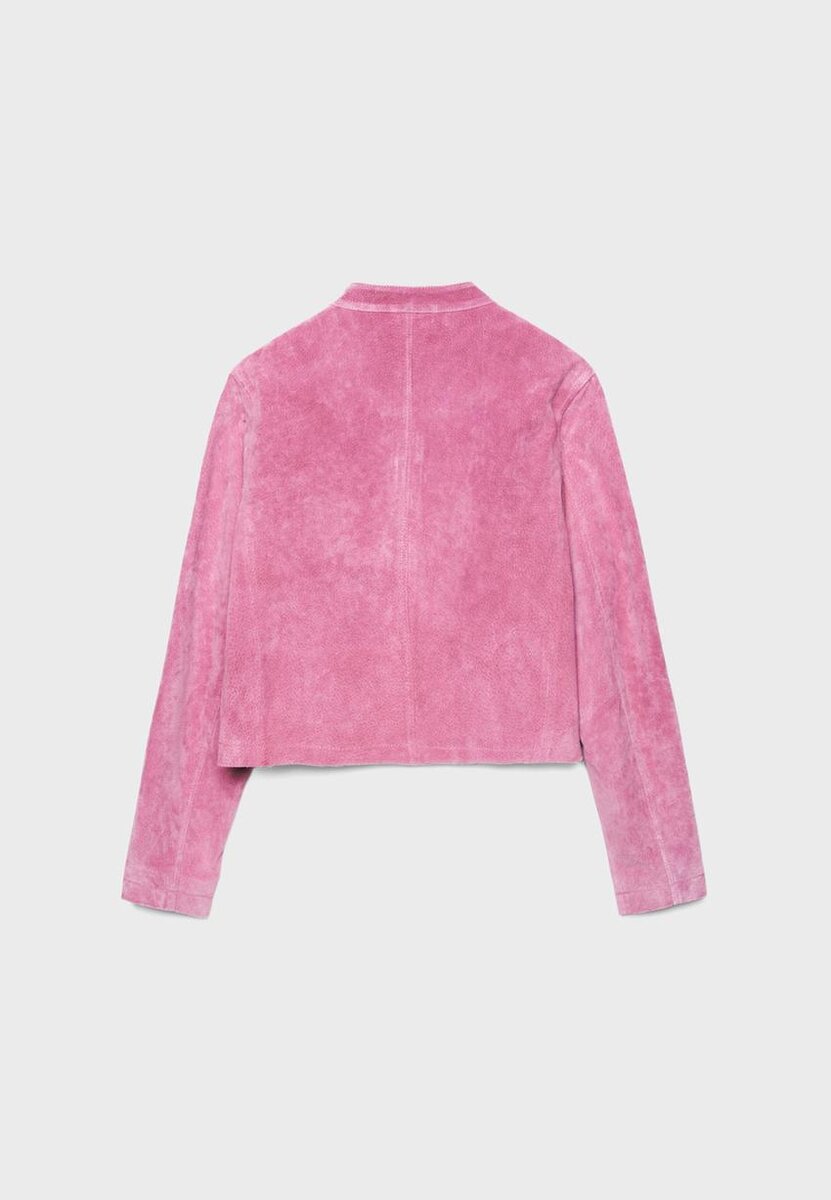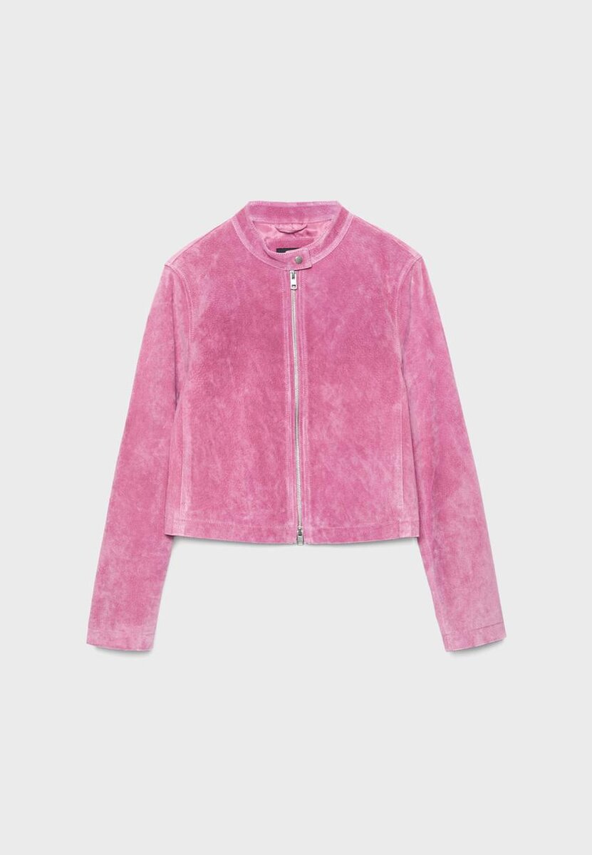 Krátká bunda vyrobená z vnějšího materiálu z vepřové kůže a polyesterové podšívky. Má vysoký límec s knoflíkem a dlouhé rukávy. Boční kapsy. Dvoucestný zip vpředu.