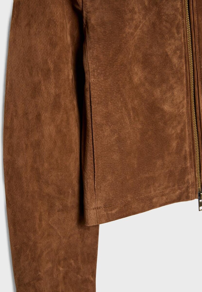 Krátká bunda vyrobená ze 100% vepřové kůže s polyesterovou podšívkou. Má vysoký límec s knoflíkem a dlouhé rukávy. Boční kapsy. Zapínání vpředu na oboustranný zip.