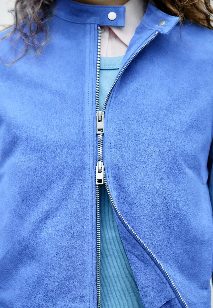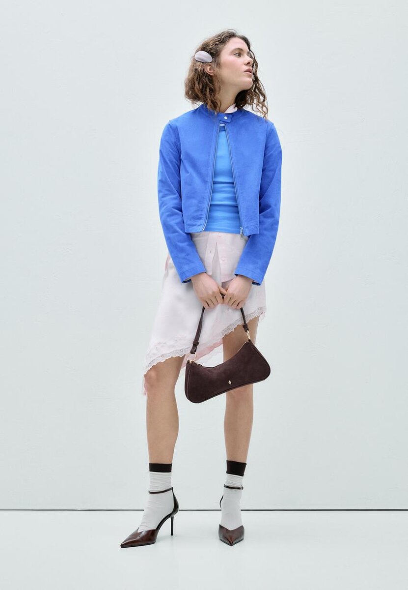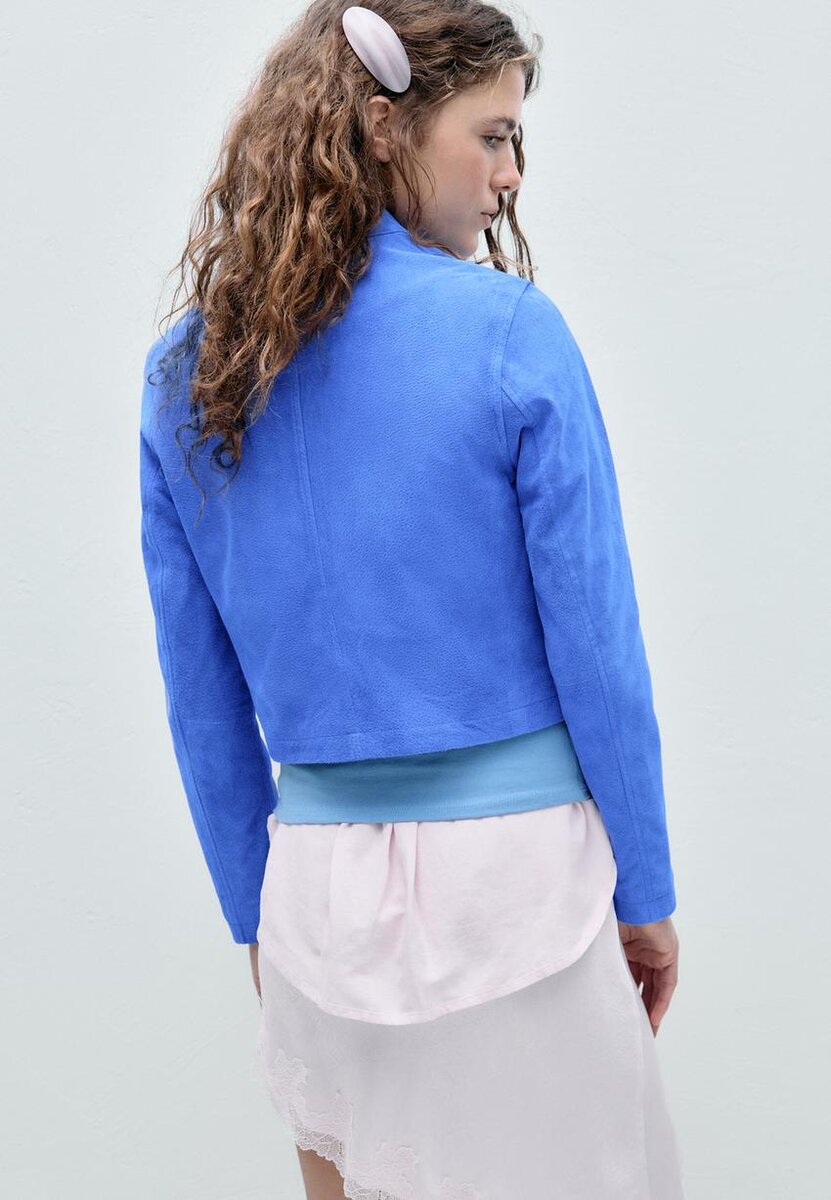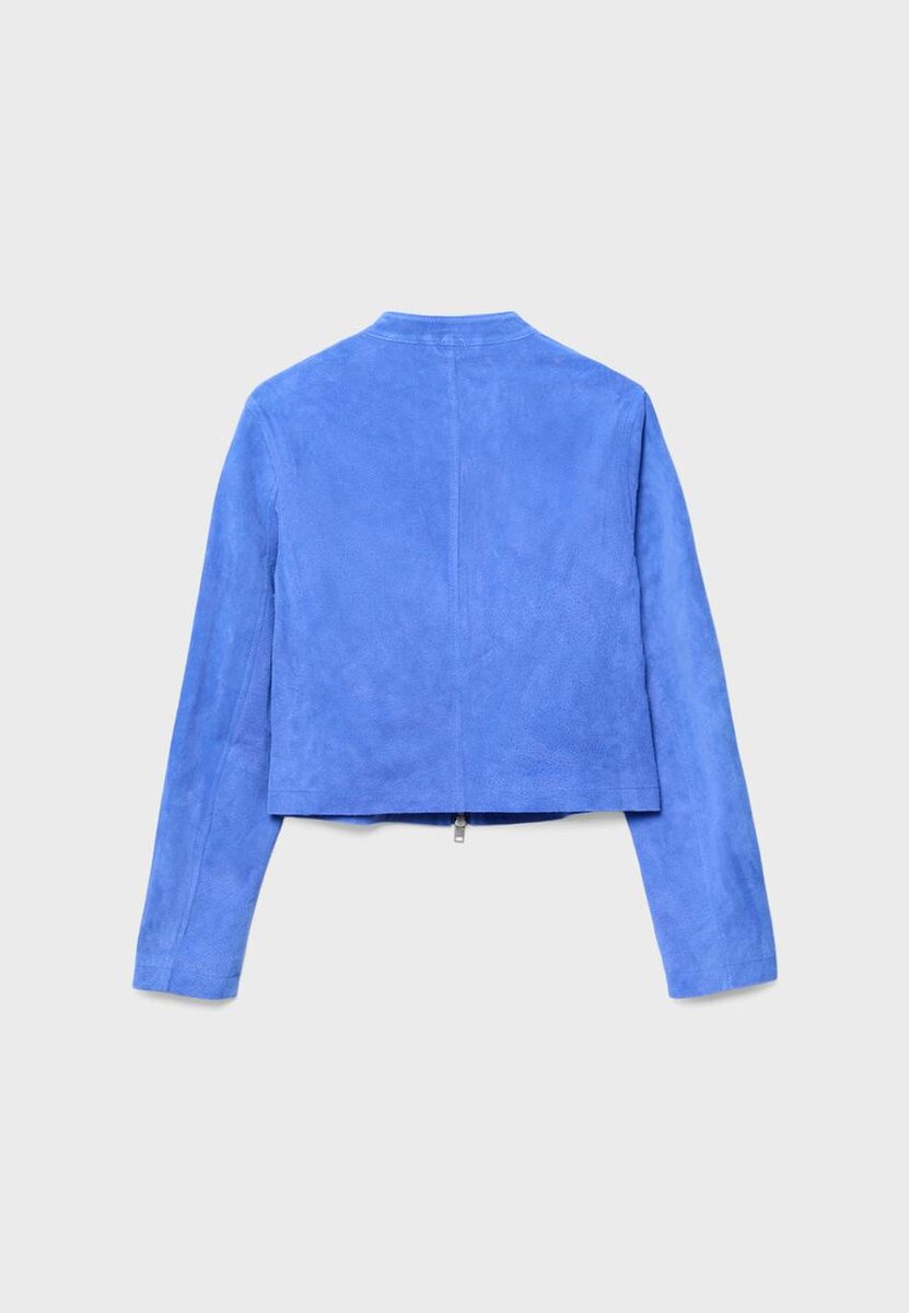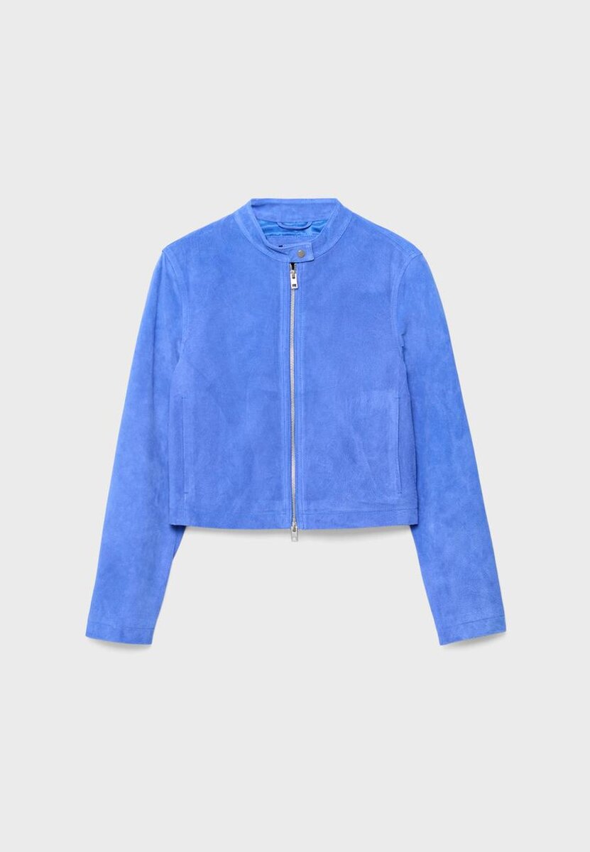 Krátká bunda vyrobená z vnějšího materiálu z vepřové kůže a polyesterové podšívky. Má vysoký límec s knoflíkem a dlouhé rukávy. Boční kapsy. Dvoucestný zip vpředu.