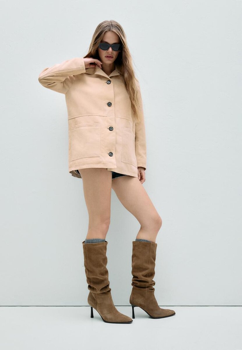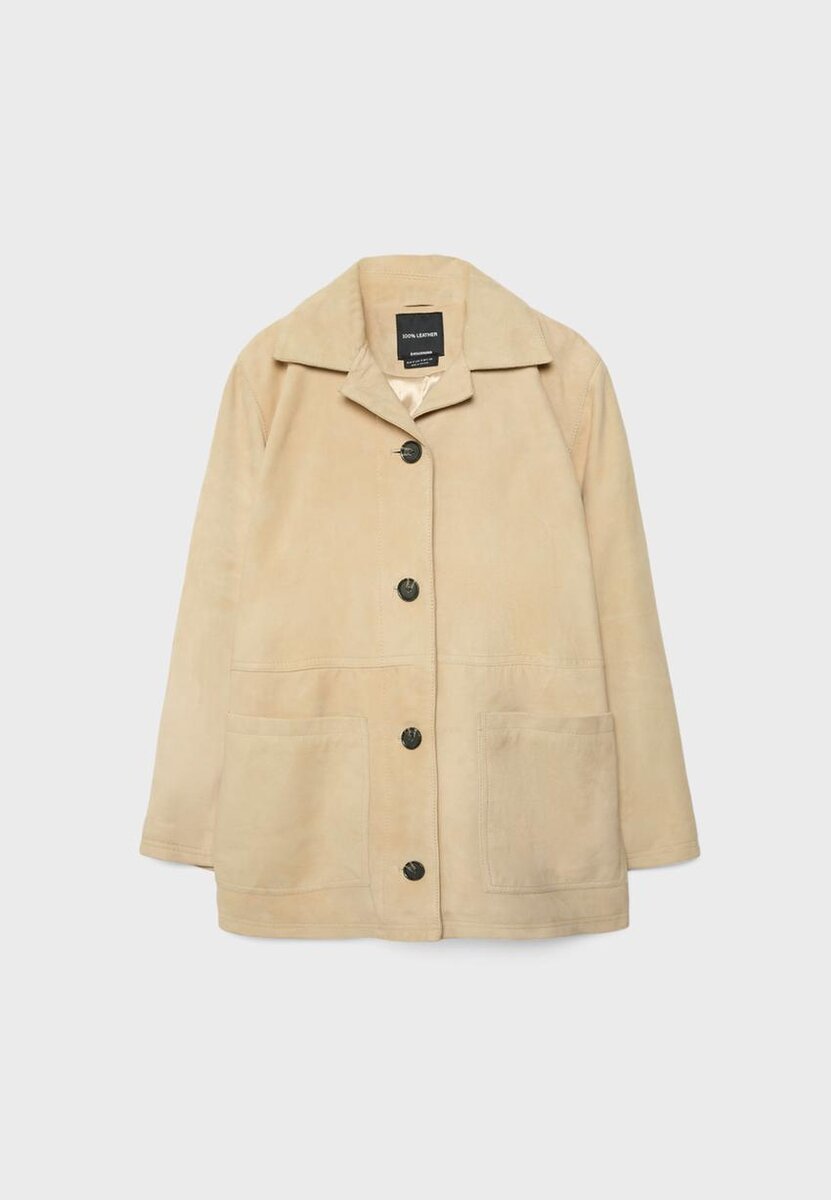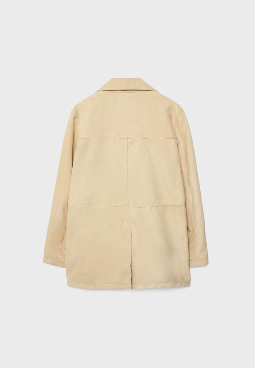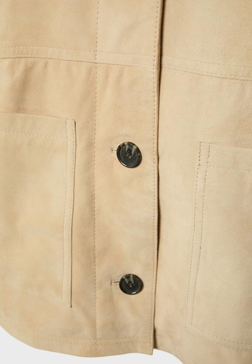 Kožená bunda. Límec s klopami a dlouhé rukávy. Náprsní našité kapsy. Zapínání vpředu na kontrastní knoflíky.