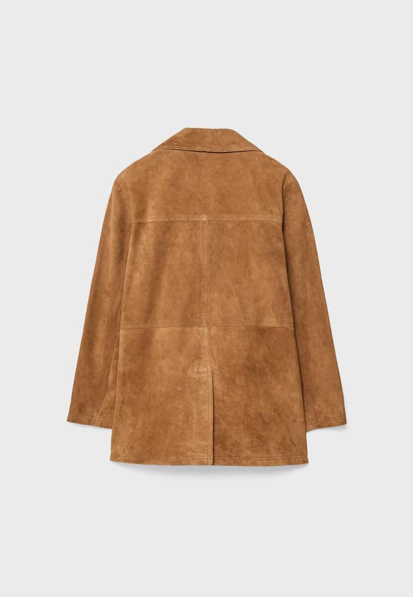 Kožená bunda. Límec s klopami a dlouhé rukávy. Náprsní kapsy. Zapínání vpředu na kontrastní knoflíky.