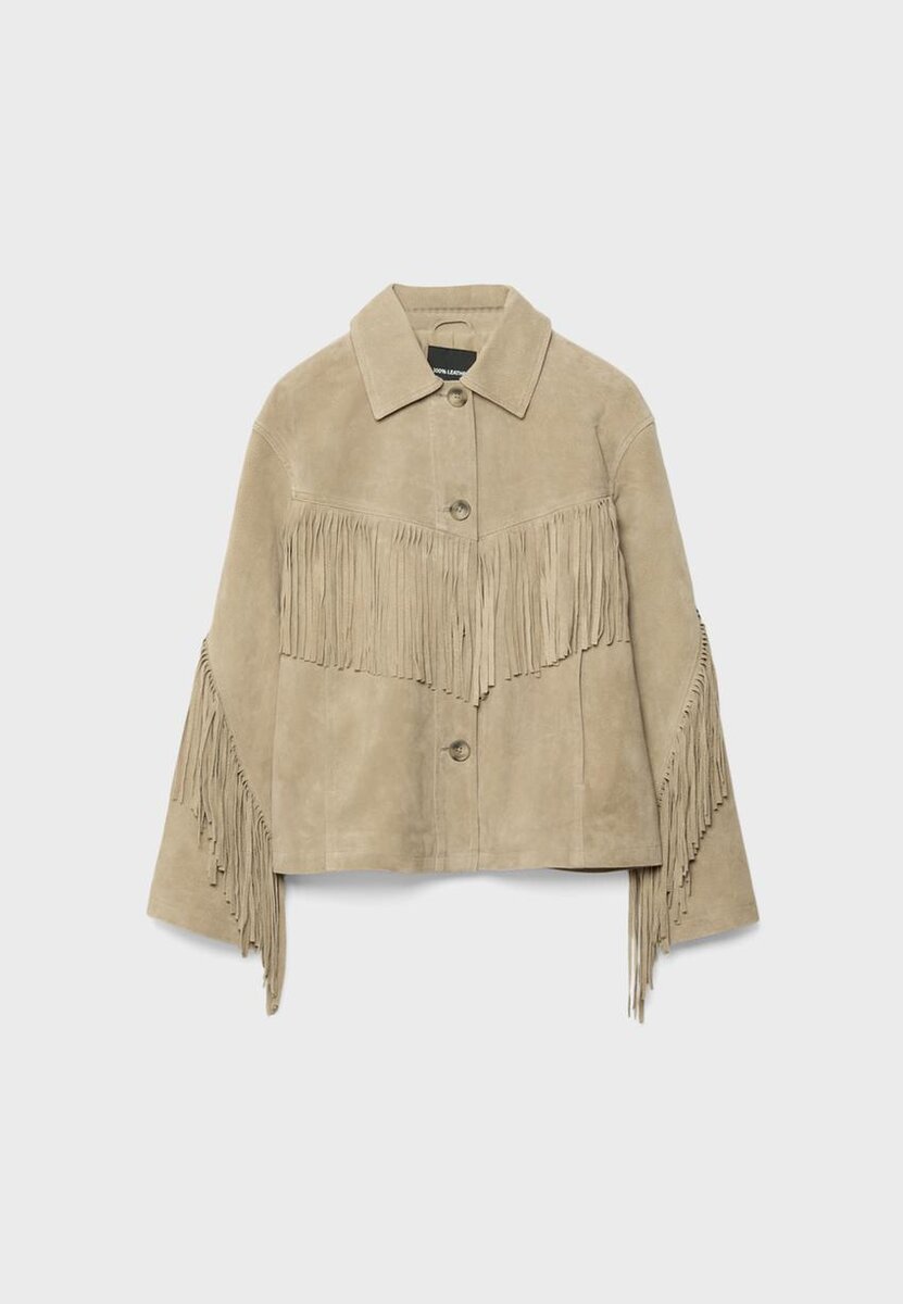 Bunda vyrobená z hlavní látky z kůže a polyesterové podšívky. Límec s klopami a dlouhé rukávy. Třásně na přední straně a rukávech. Zapínání na knoflíky vpředu.