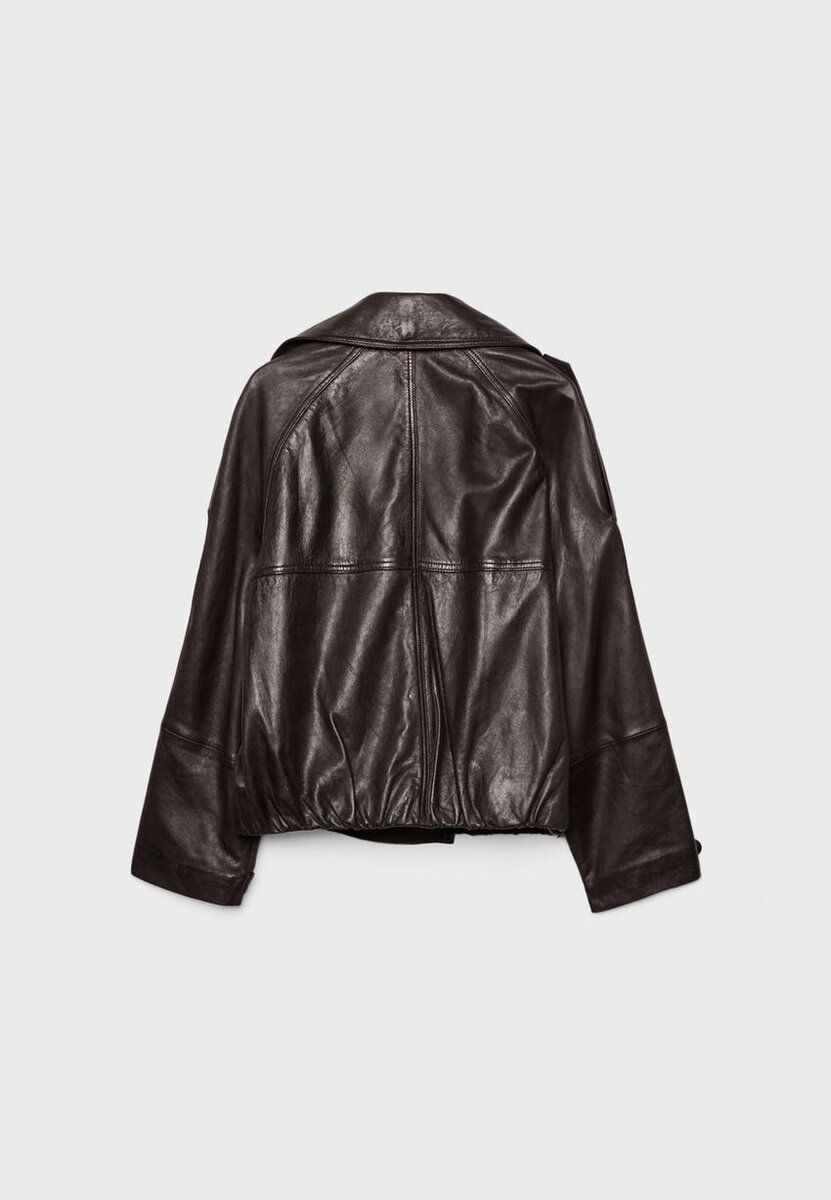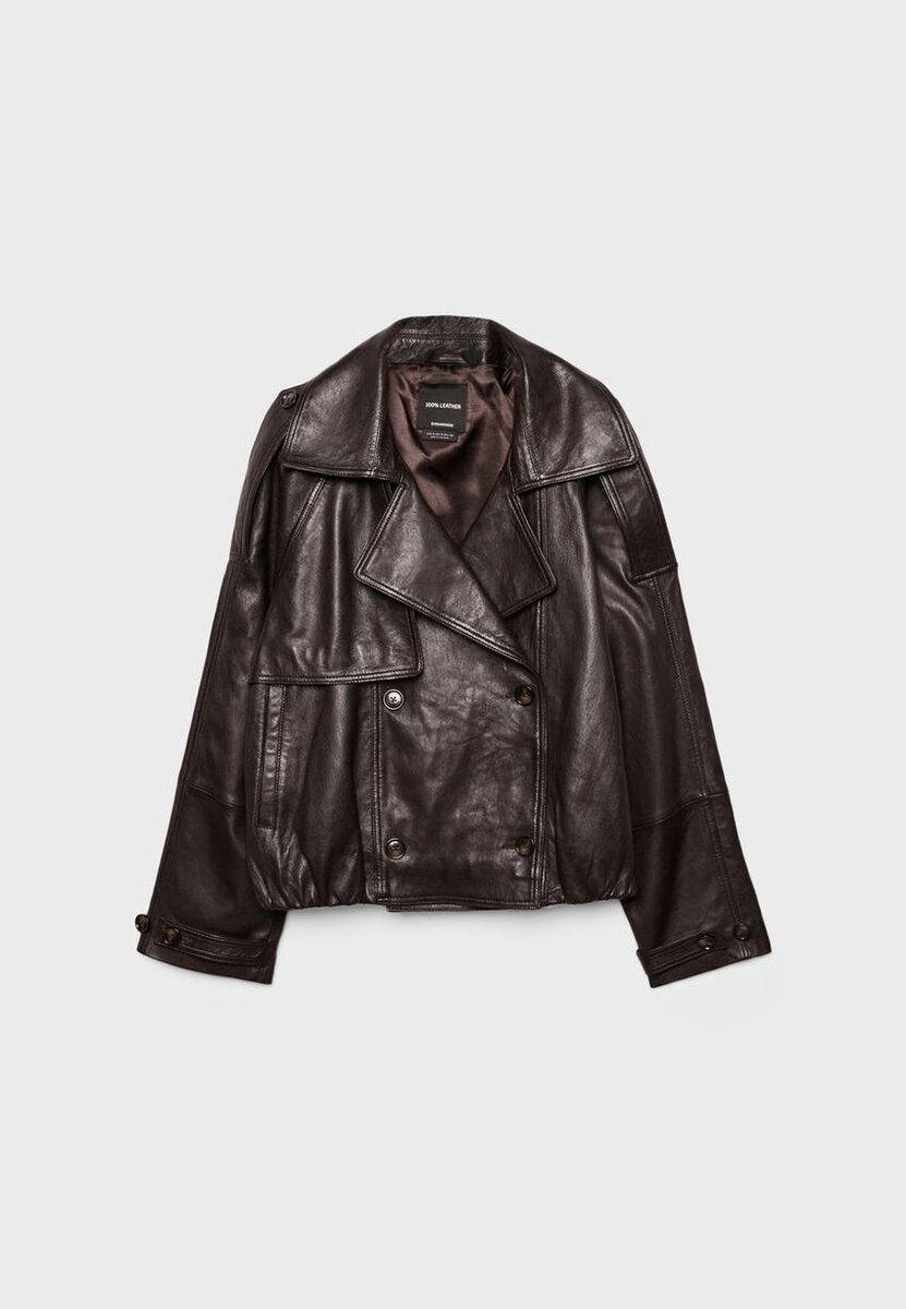 Krátký oversize kožený trenčkot s polyesterovou podšívkou. S klopovým límcem a dlouhými rukávy s poutky a knoflíky. Boční kapsy. Dvouřadé zapínání na knoflíky vpředu.