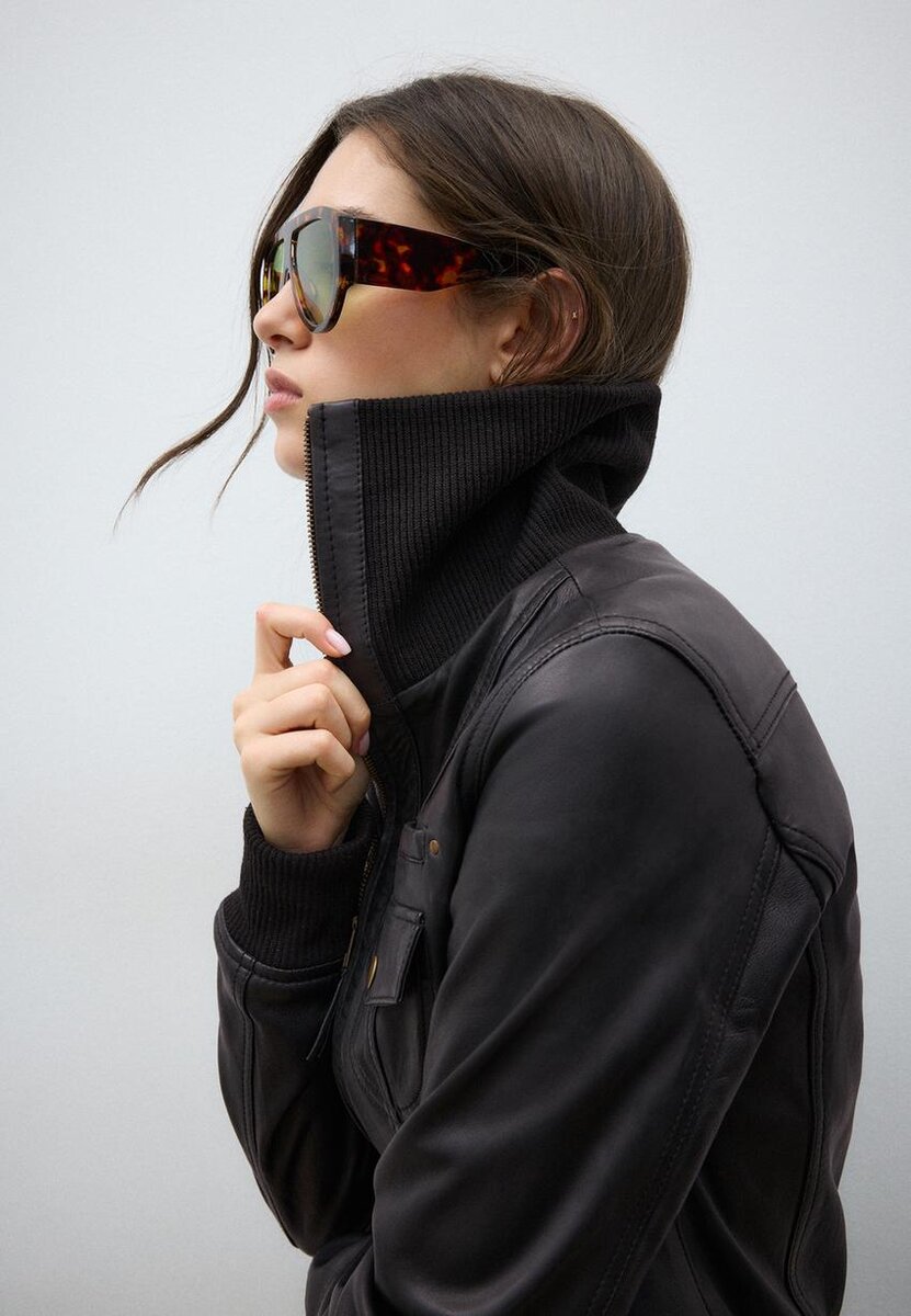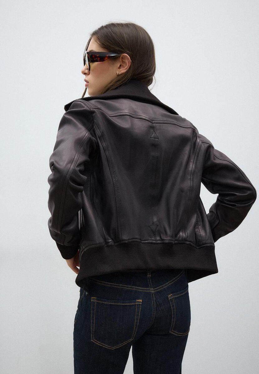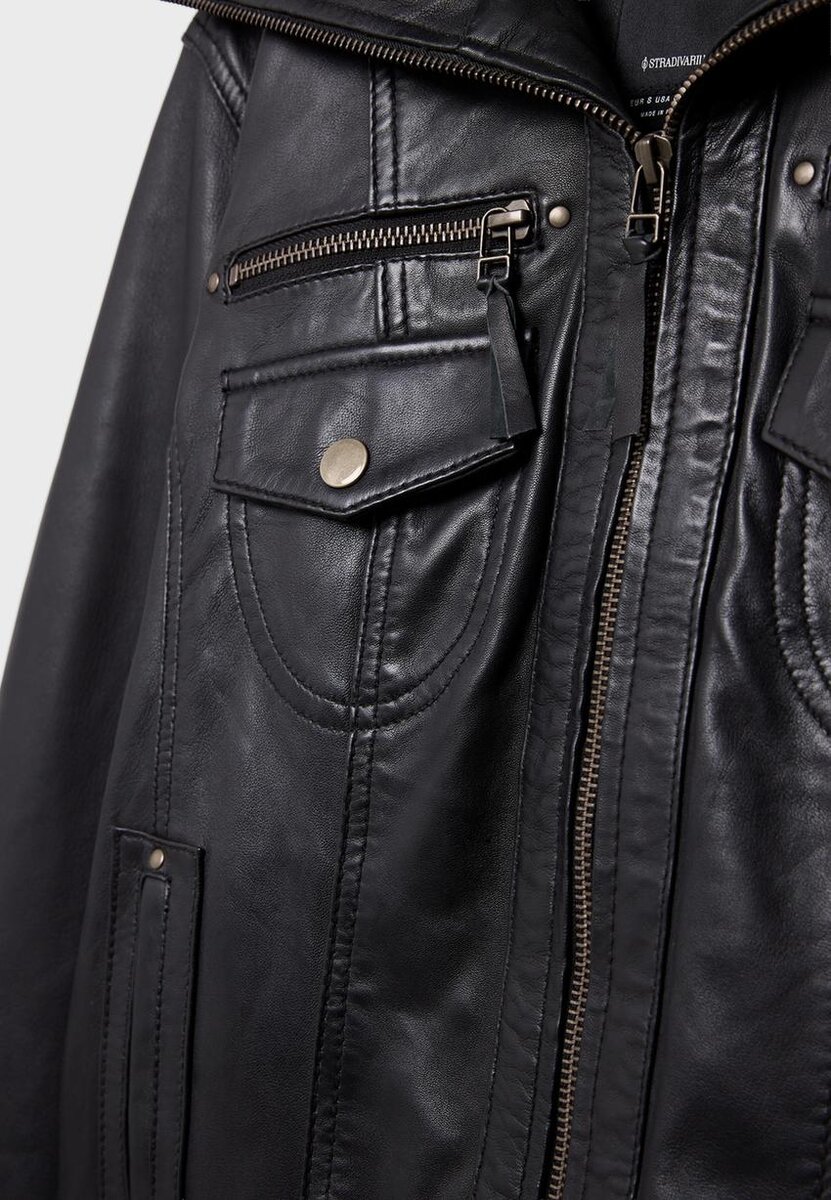 Bundová souprava z kůže. Límec s klopami a dlouhé rukávy s elastickými manžetami. Boční kapsy s lemováním a více kapes se zipem a knoflíky na hrudi. Detaily z žebrovaného úpletu v ladícím odstínu. Zapínání vpředu na kovový zip.